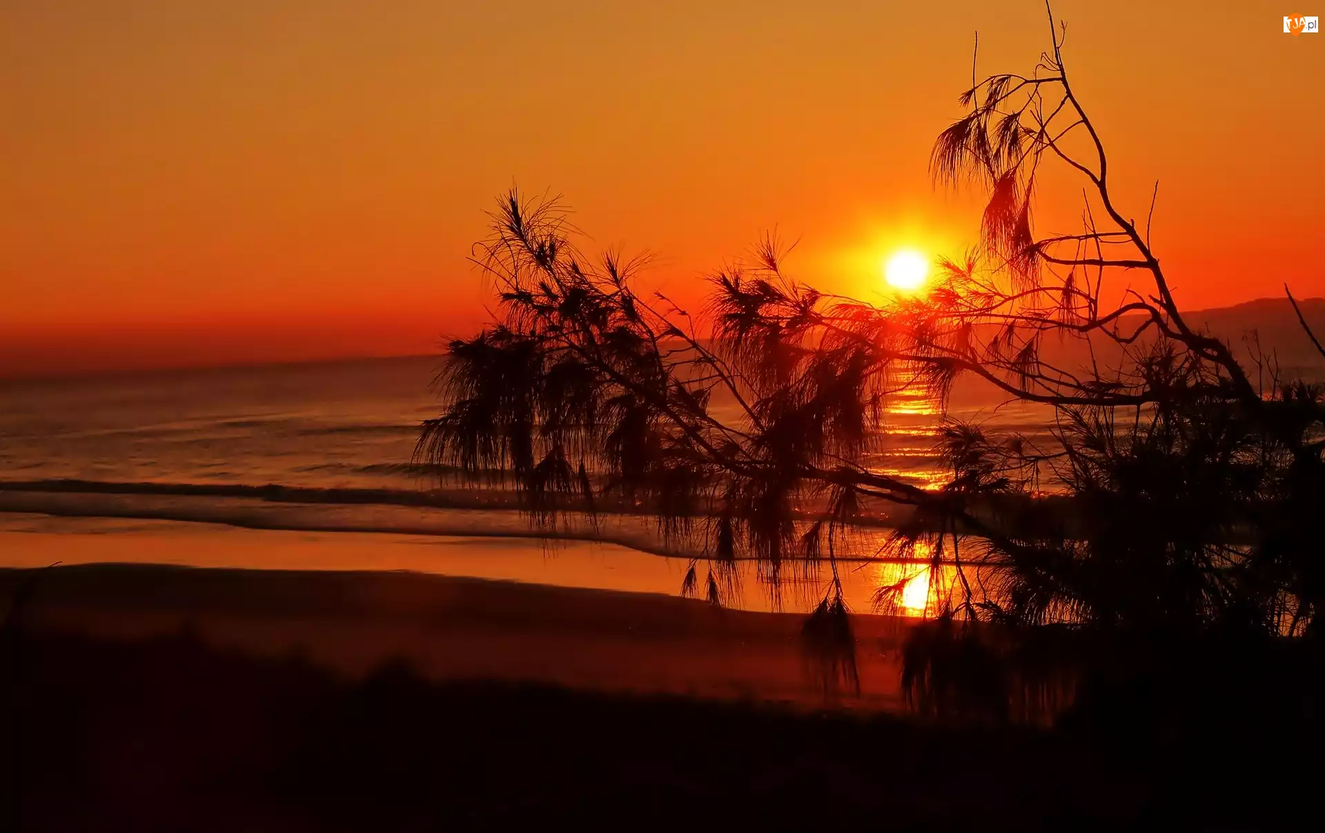 Drzew, Zachód, Morze, Słońca, Gałęzie