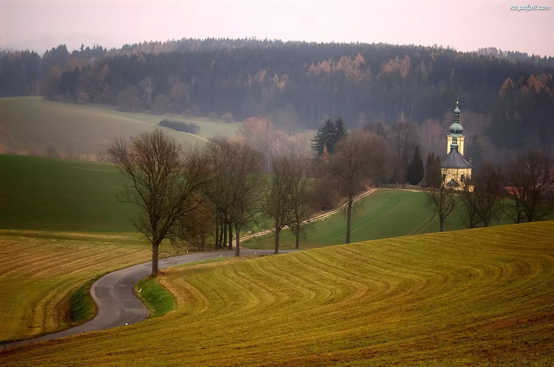 Drzewa, Budynki, Góry, Las, Droga, Pole