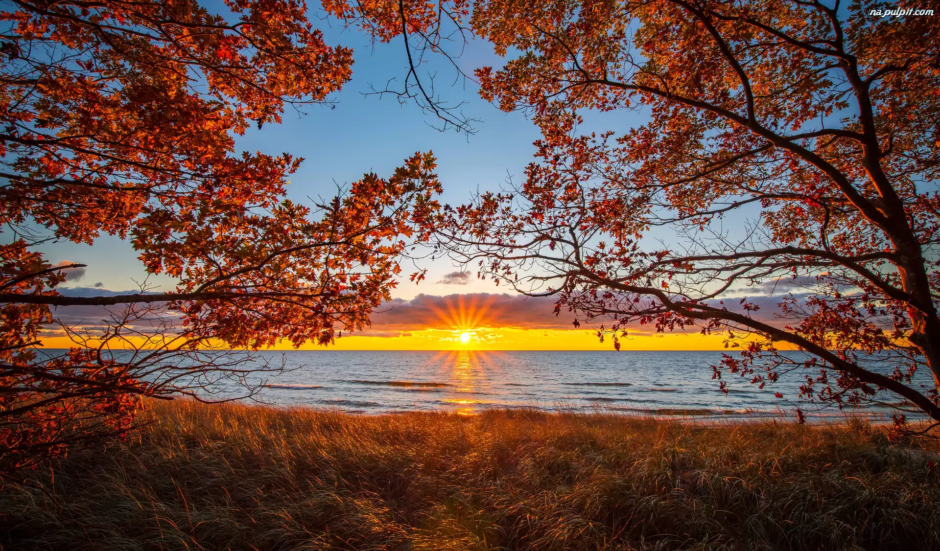 Drzewa, Chmury, Gałęzie, Jezioro, Wschód słoń
