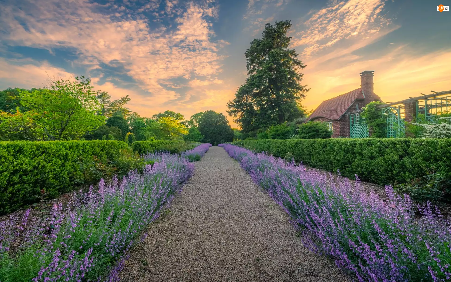 Drzewa, Chmury, Lawenda, Ogród, Dom