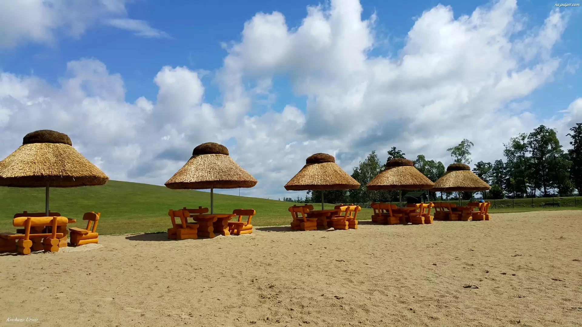Parasole, Drzewa, Plaża, Chmury, Ławki