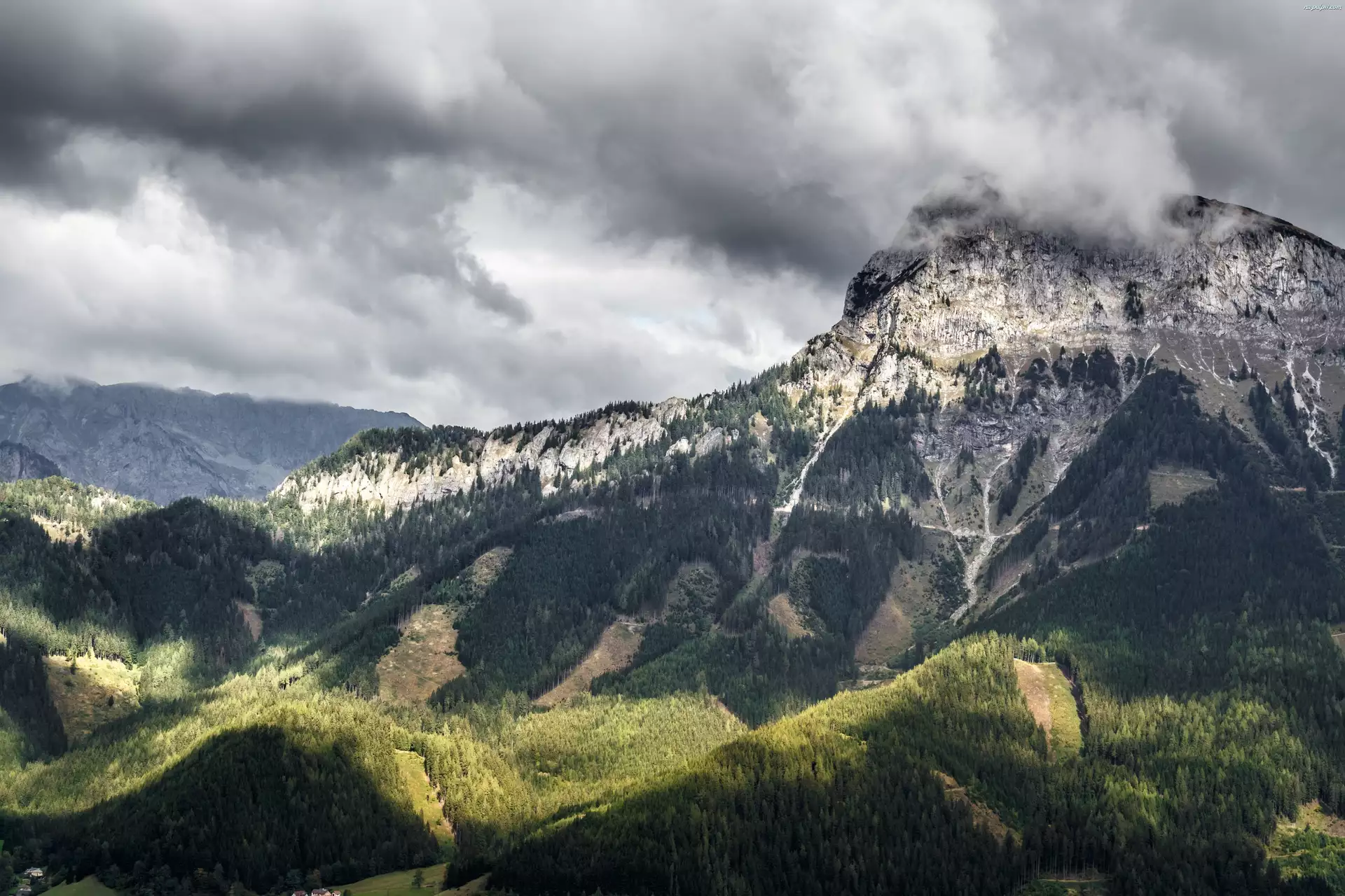 Drzewa, Chmury, Urwisko, Góry, Trawa