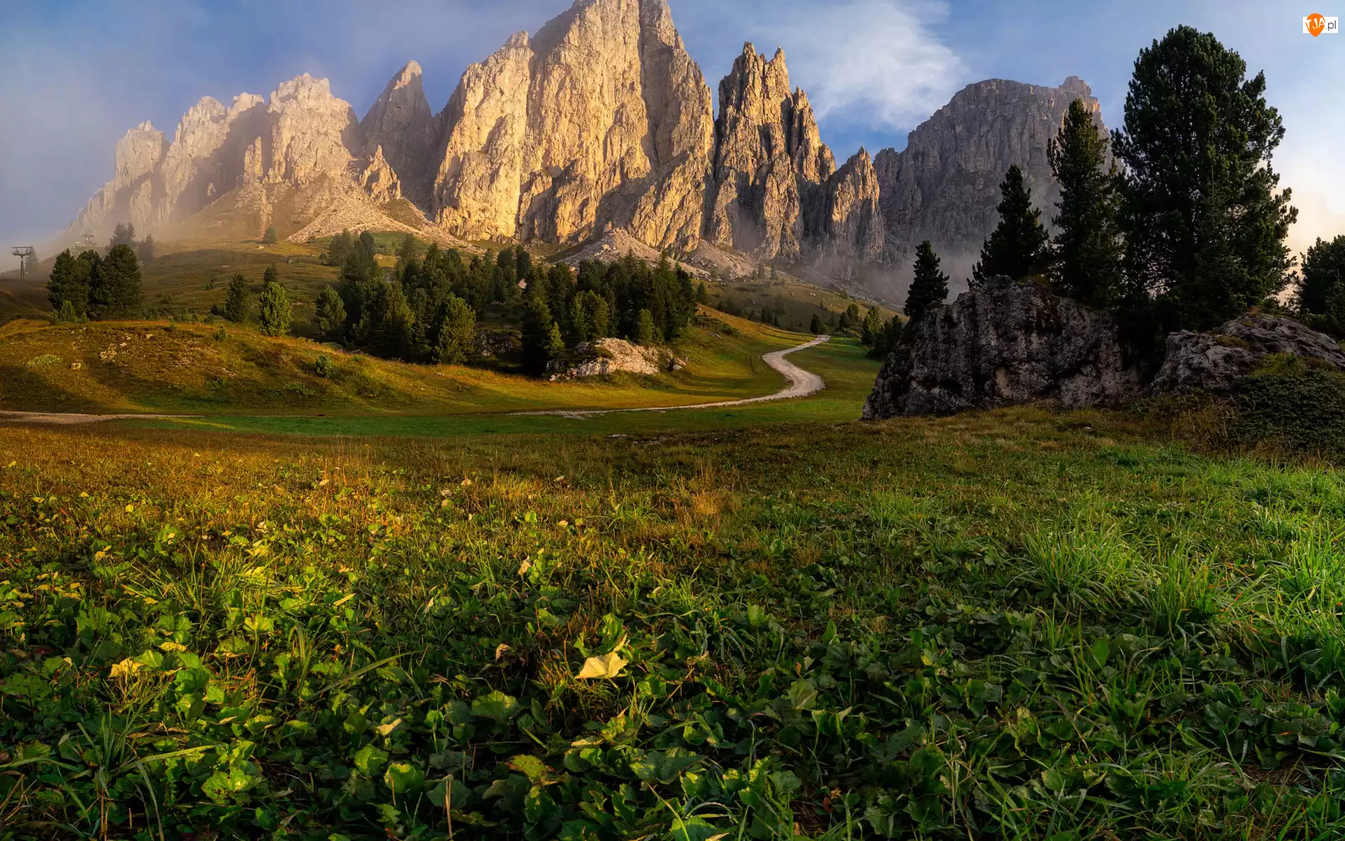 Drzewa, Góry, Łąki, Południowy Tyrol, Dolomity