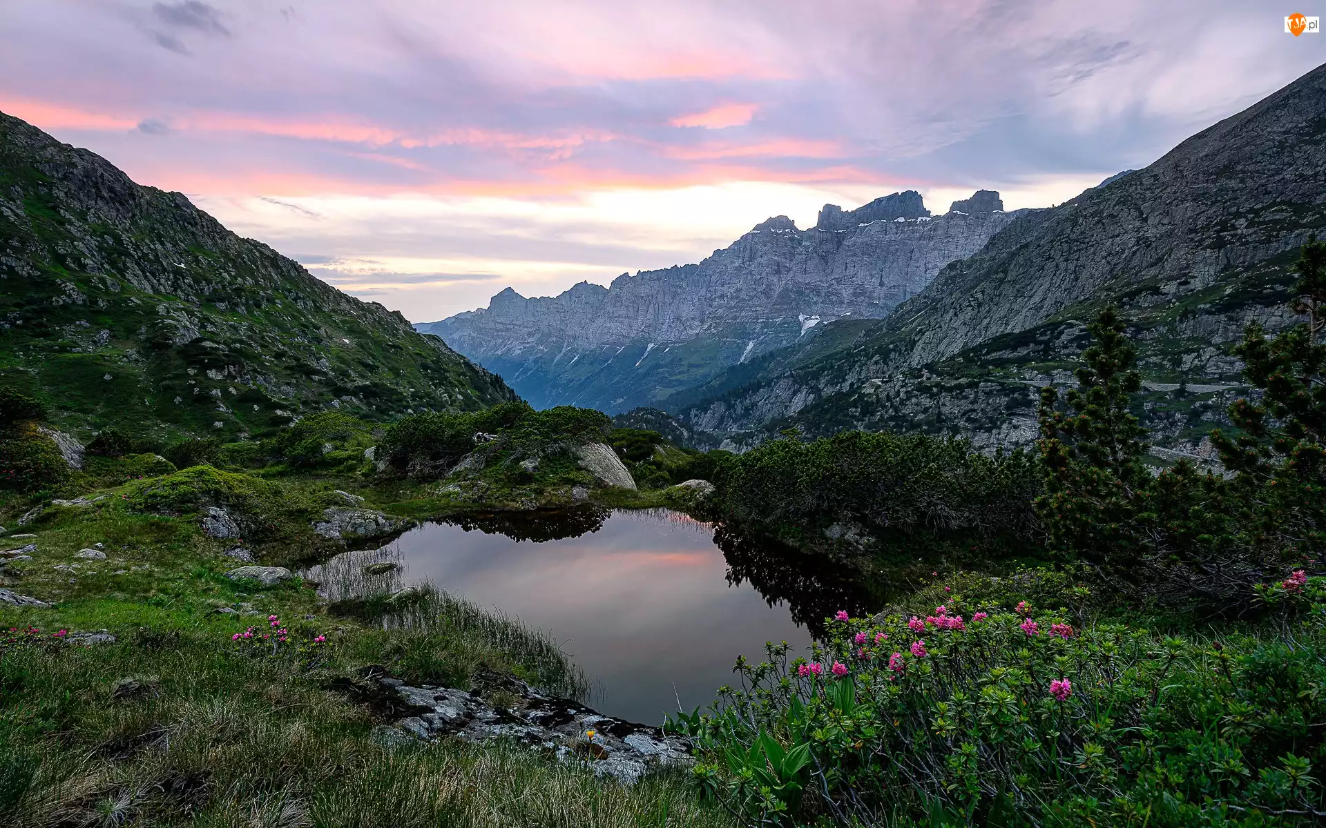 Drzewa, Góry, Różanecznik, Kałuża, Kwiaty, Woda