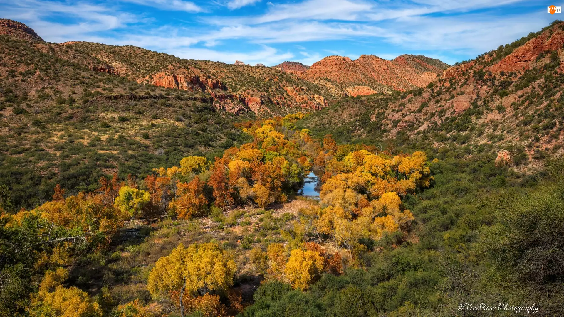 Drzewa, Góry, Stany Zjednoczone, Jesień, Arizona, Kanion Sycamore, Rzeka