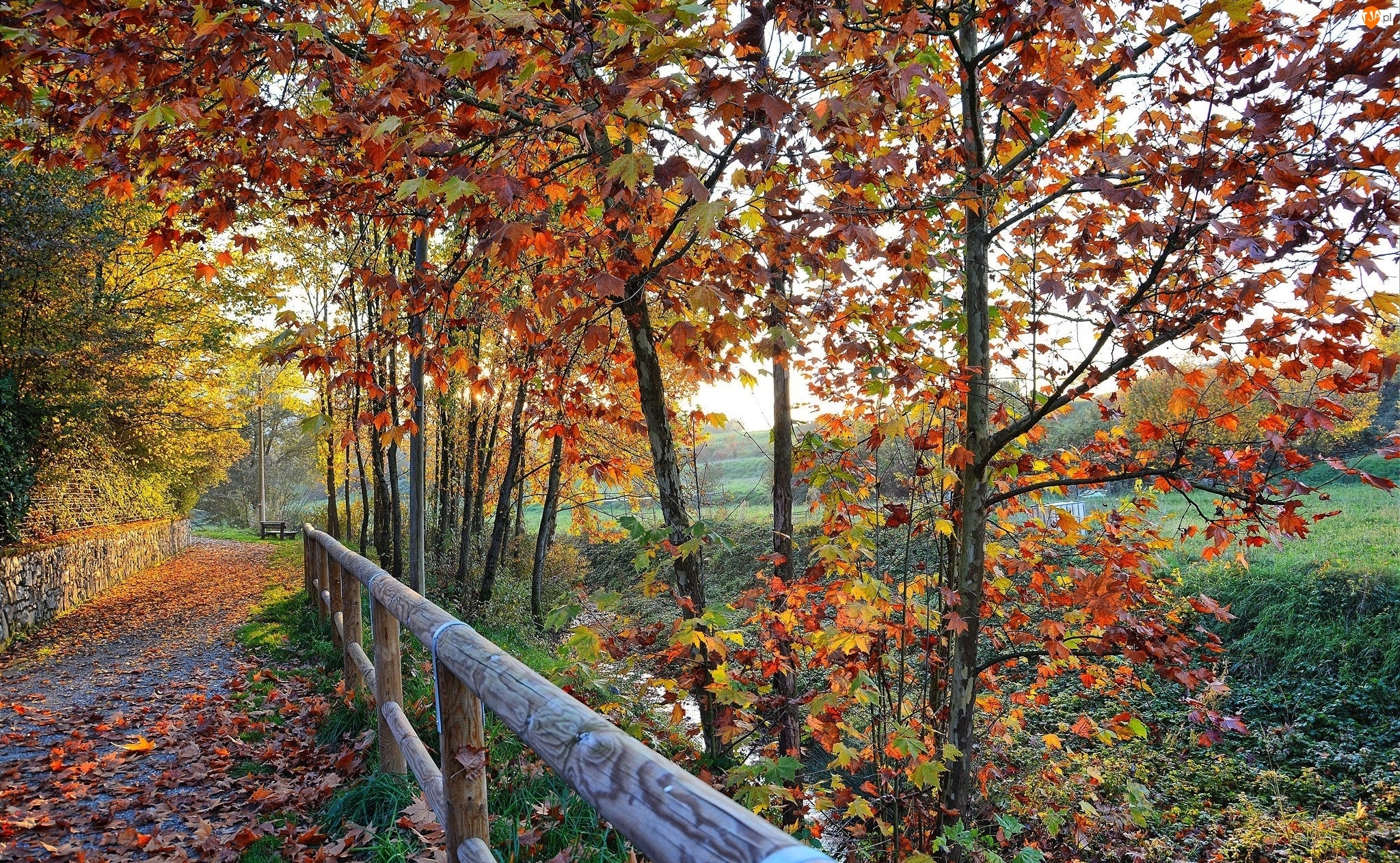 Ogrodzenie, Jesień, Droga, Drzewa, Liście