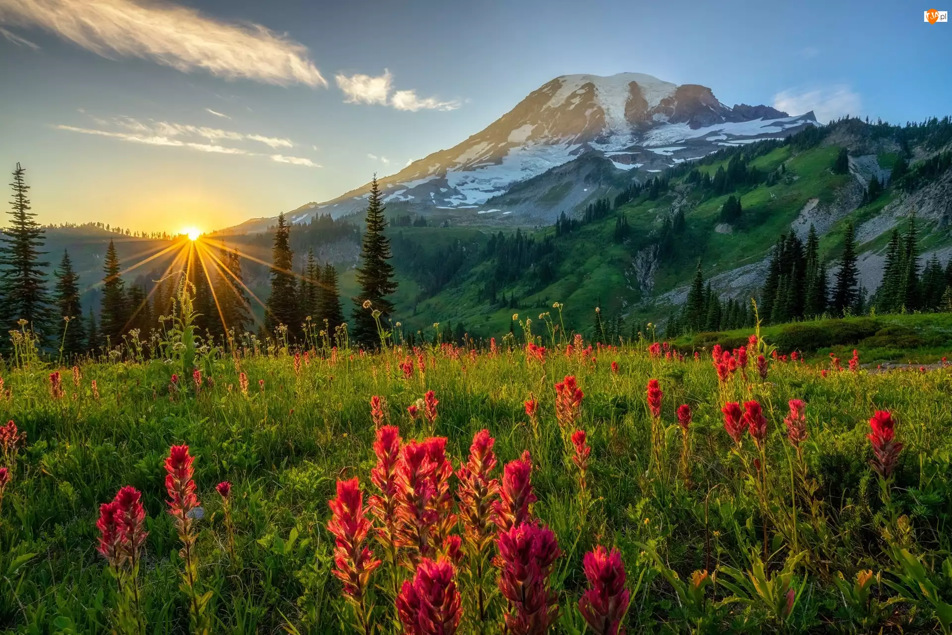 Stany Zjednoczone, Góry, Stan Waszyngton, Kwiaty, Promienie słońca, Park Narodowy Mount Rainier, Drzewa, Stratowulkan Mount Rainier, Łąka