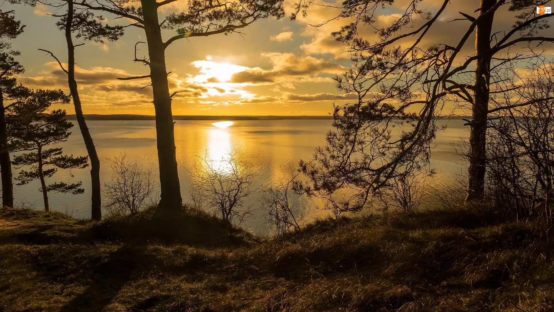 Drzewa, Zachód słońca, Morze Bałtyckie, Wyspa Uznam