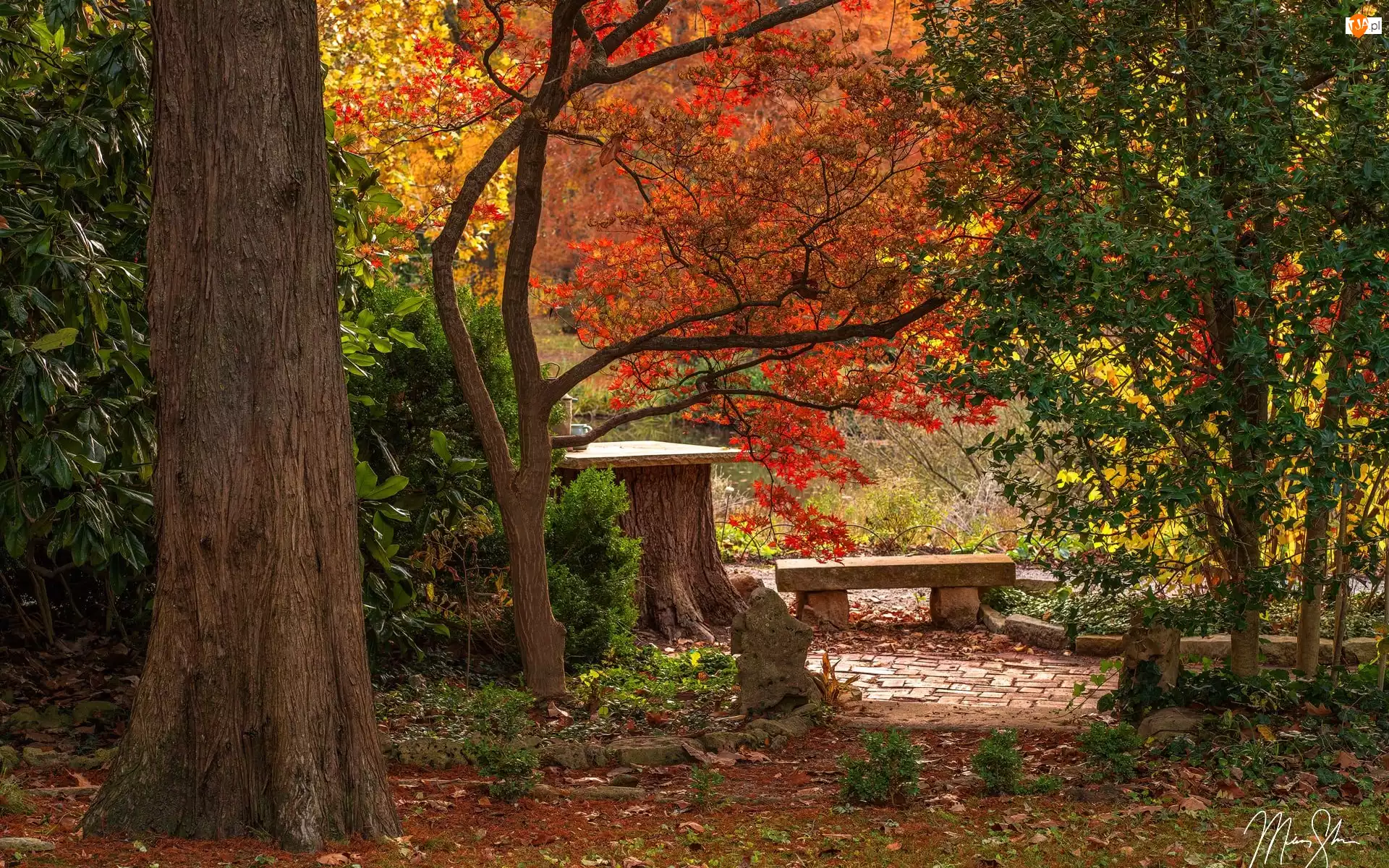 Drzewa, Jesień, Kolorowe, Park, Ławka