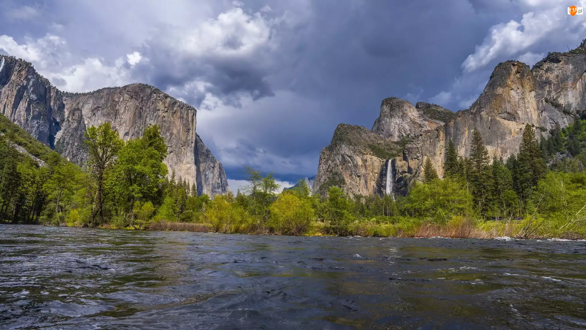 Drzewa, Kalifornia, Merced River, Chmury, Rzeka, Park Narodowy Yosemite, Góry, Stany Zjednoczone, Niebo