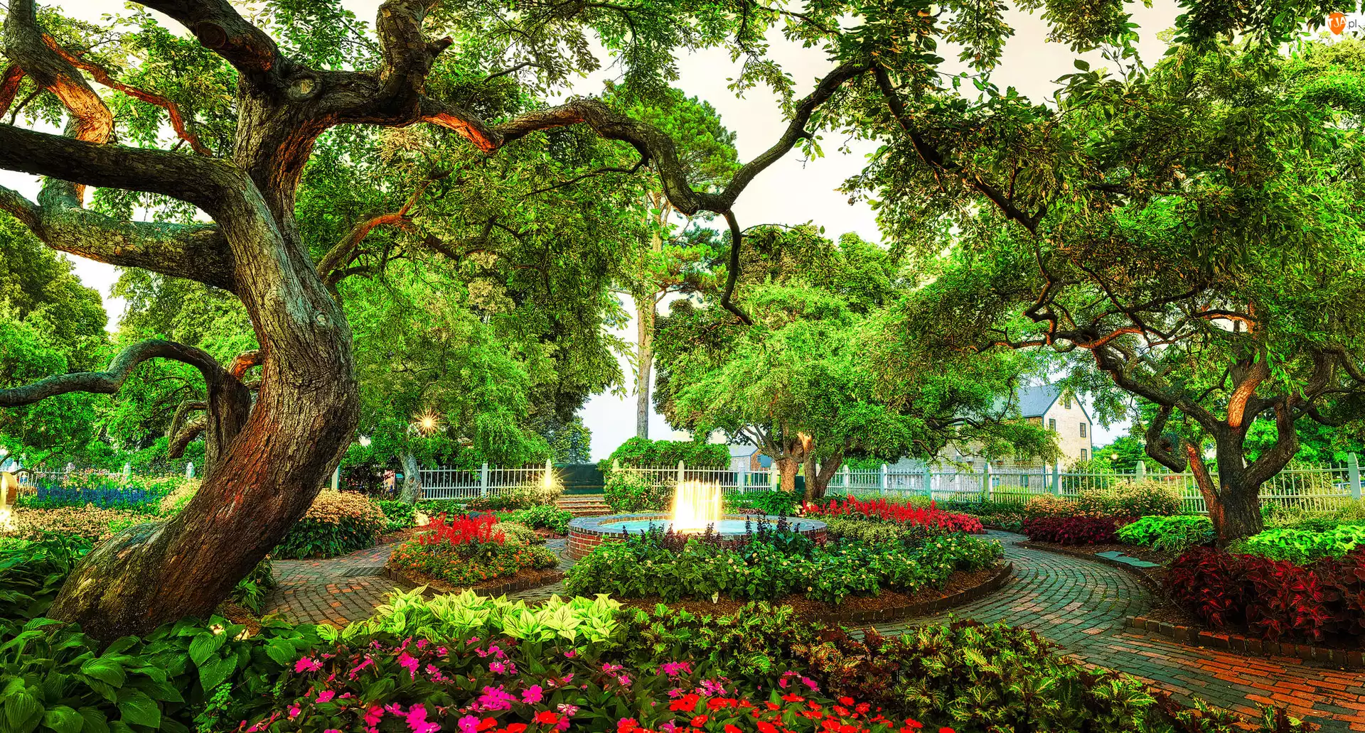 Stany Zjednoczone, Prescott Park, Stan New Hampshire, Fontanna, Portsmouth, Wiosna, Kwiaty, Park, Drzewa