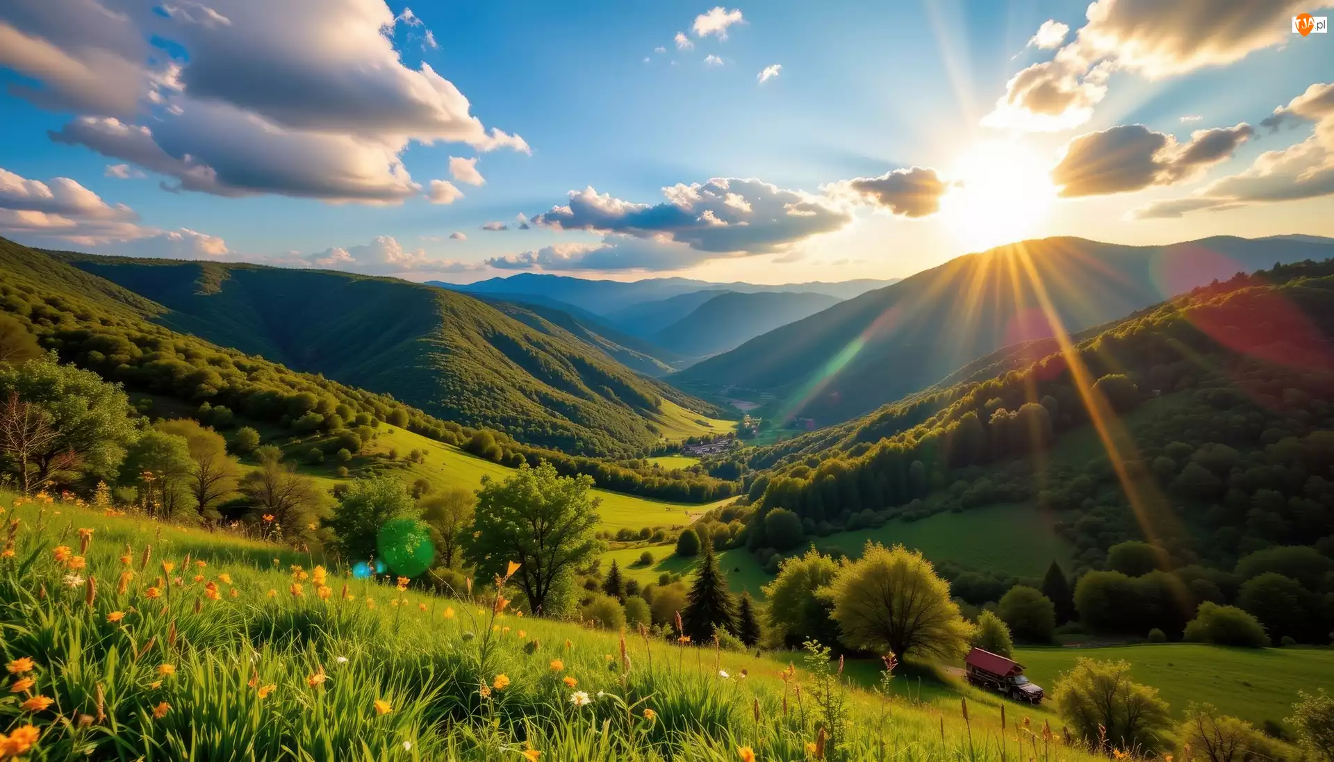 Drzewa, Łąka, Dolina, Grafika, Góry, Promienie słoneczne