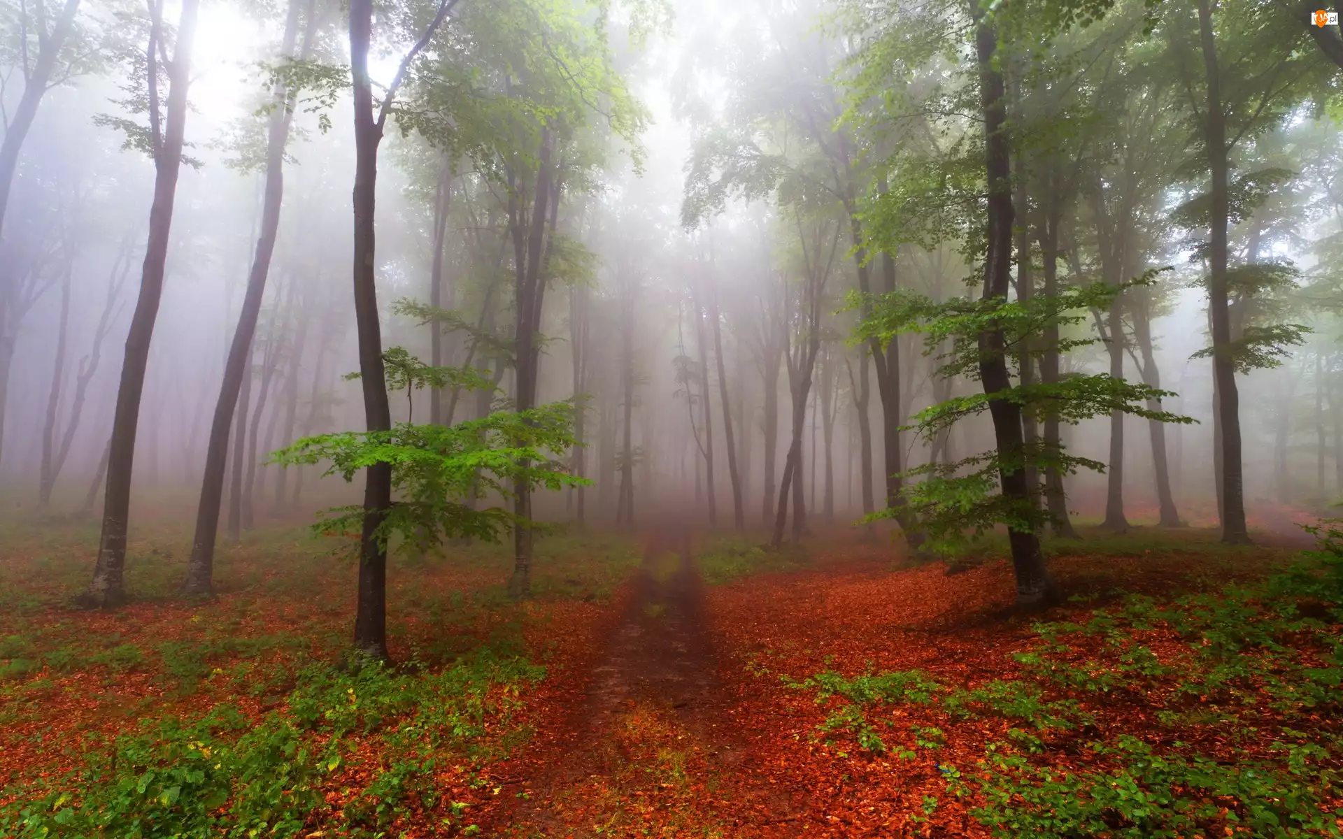 Drzewa, Mgła, Las, Jesień, Ścieżka, Liście