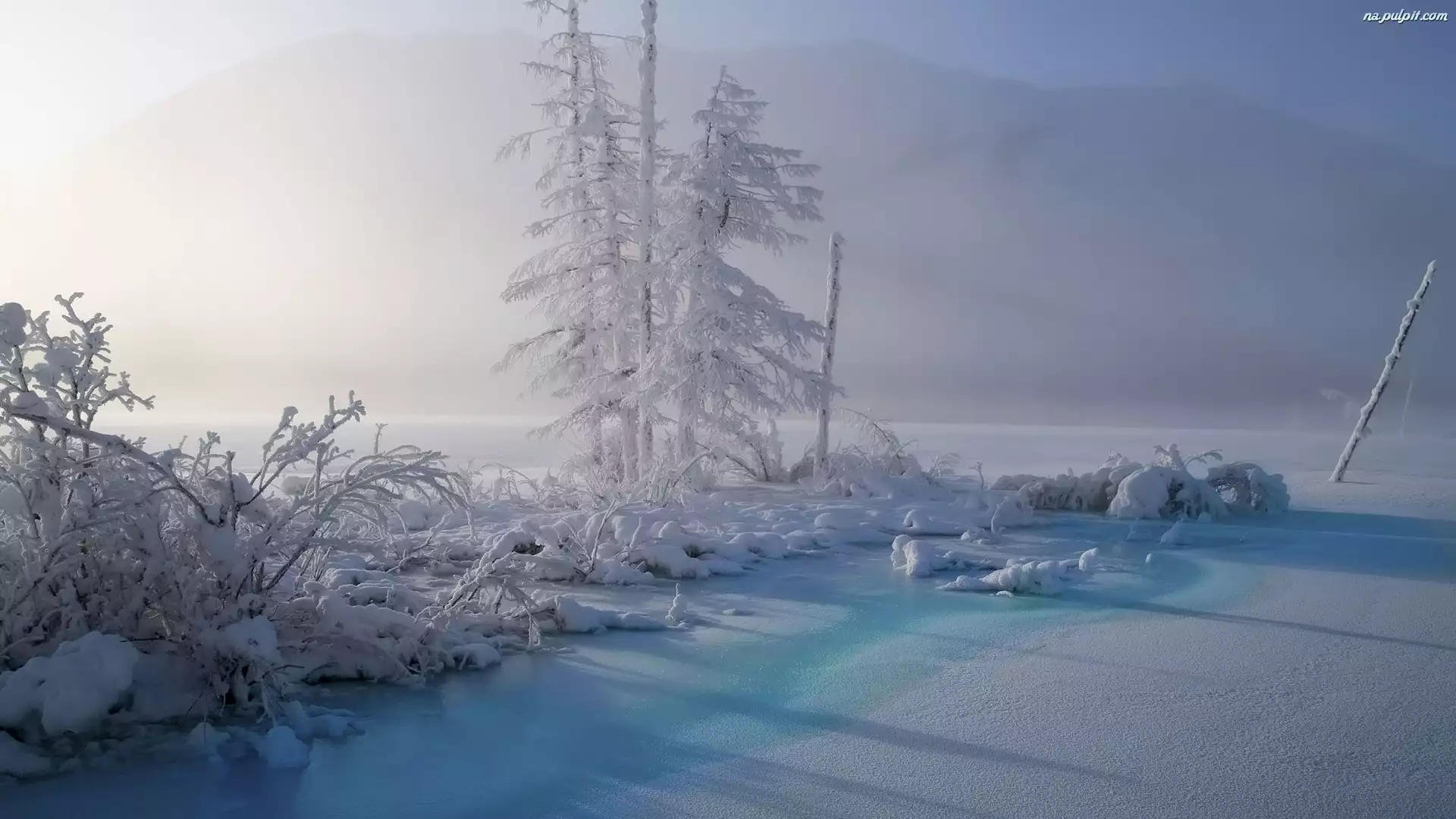 Drzewa, Mgła, Śnieg, Zima, Góry
