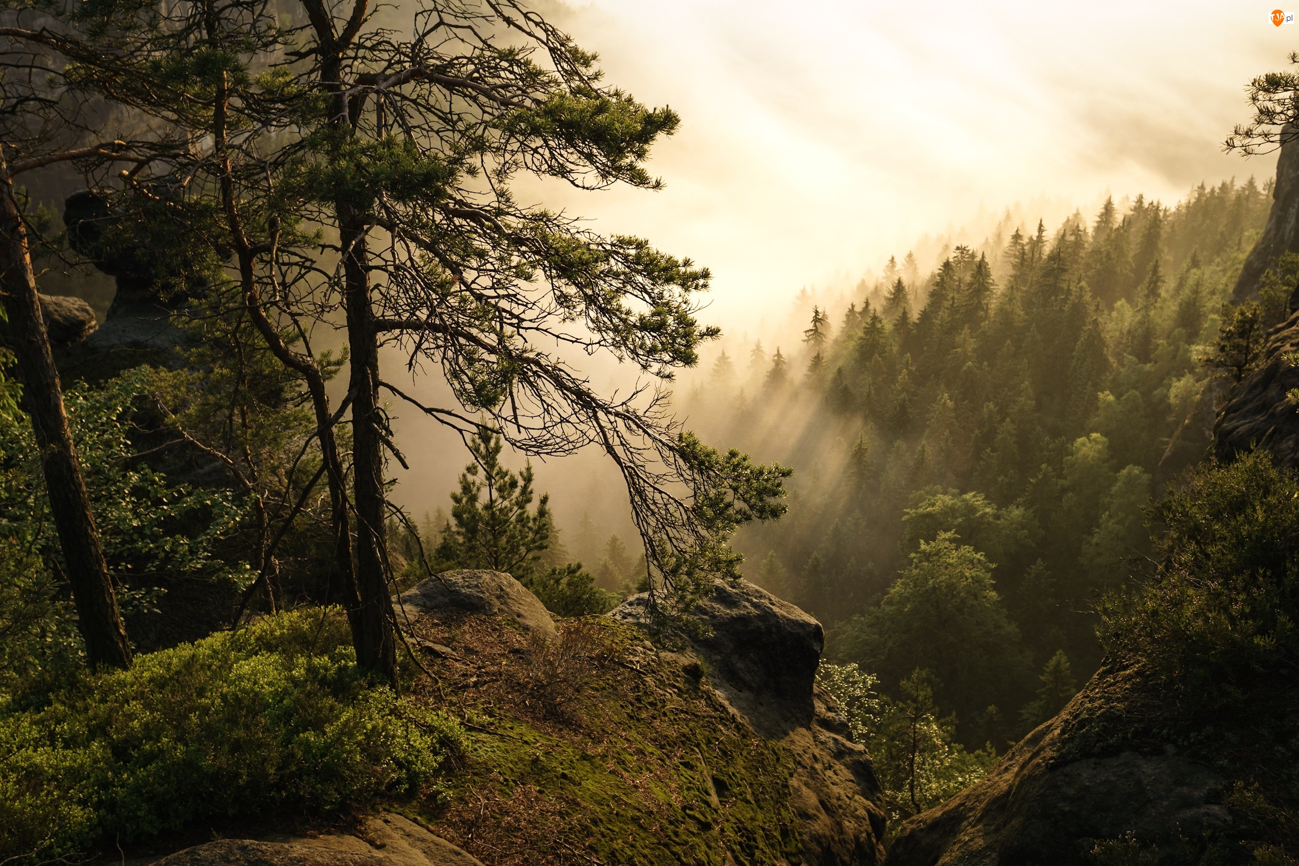 Mgła, Niemcy, Góry Połabskie, Park Narodowy Saska Szwajcaria, Drzewa