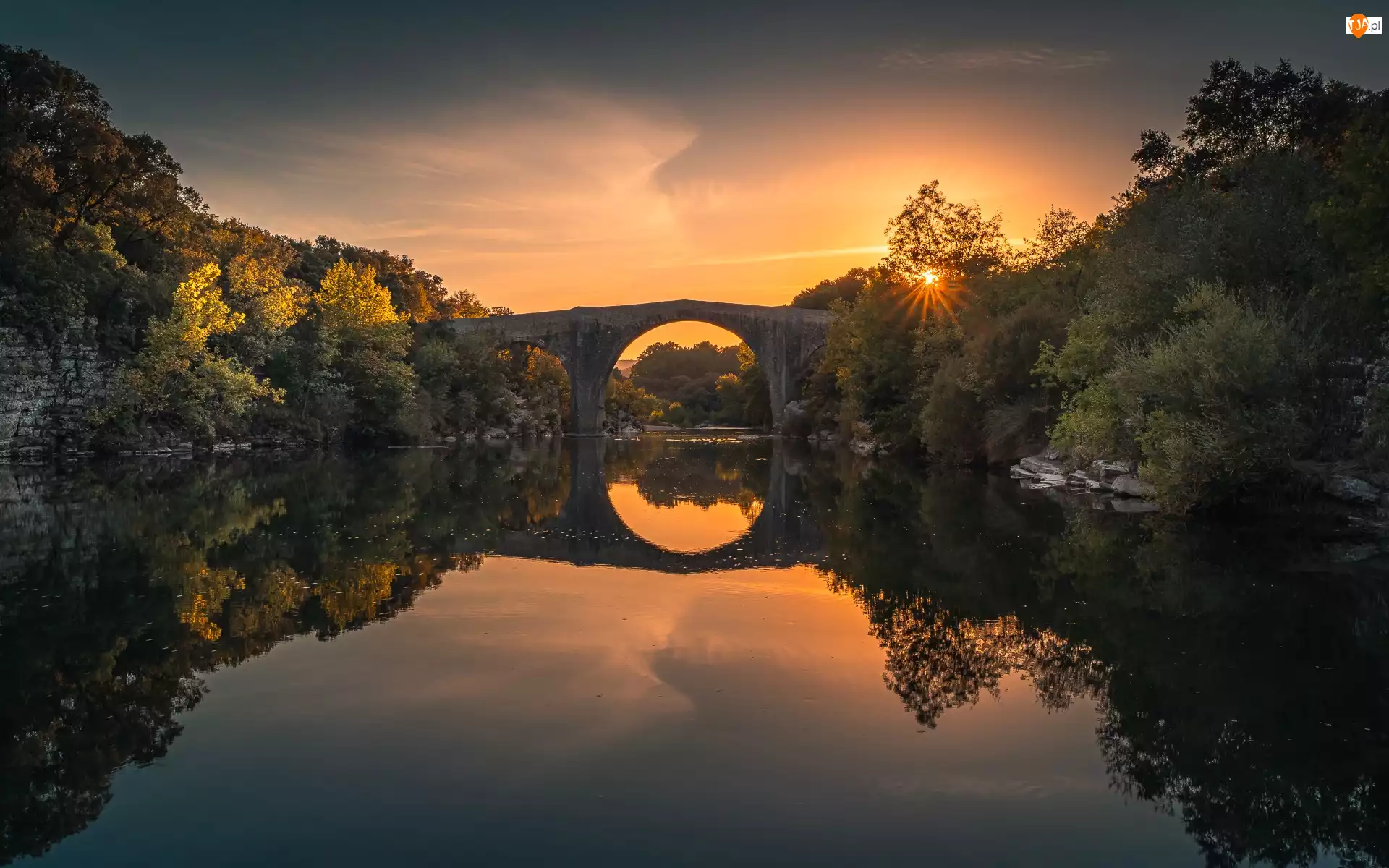 Drzewa, Odbicie, Most, Jezioro, Zachód słońca