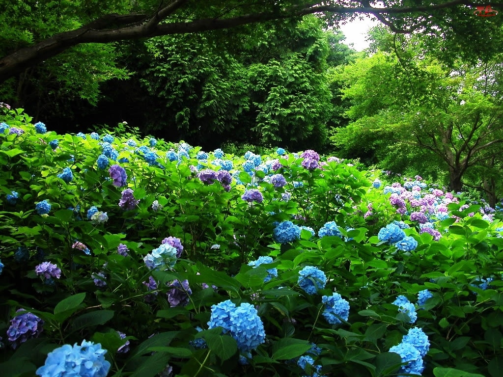 Drzewa, Ogród, Niebieska, Hortensja, Różowa