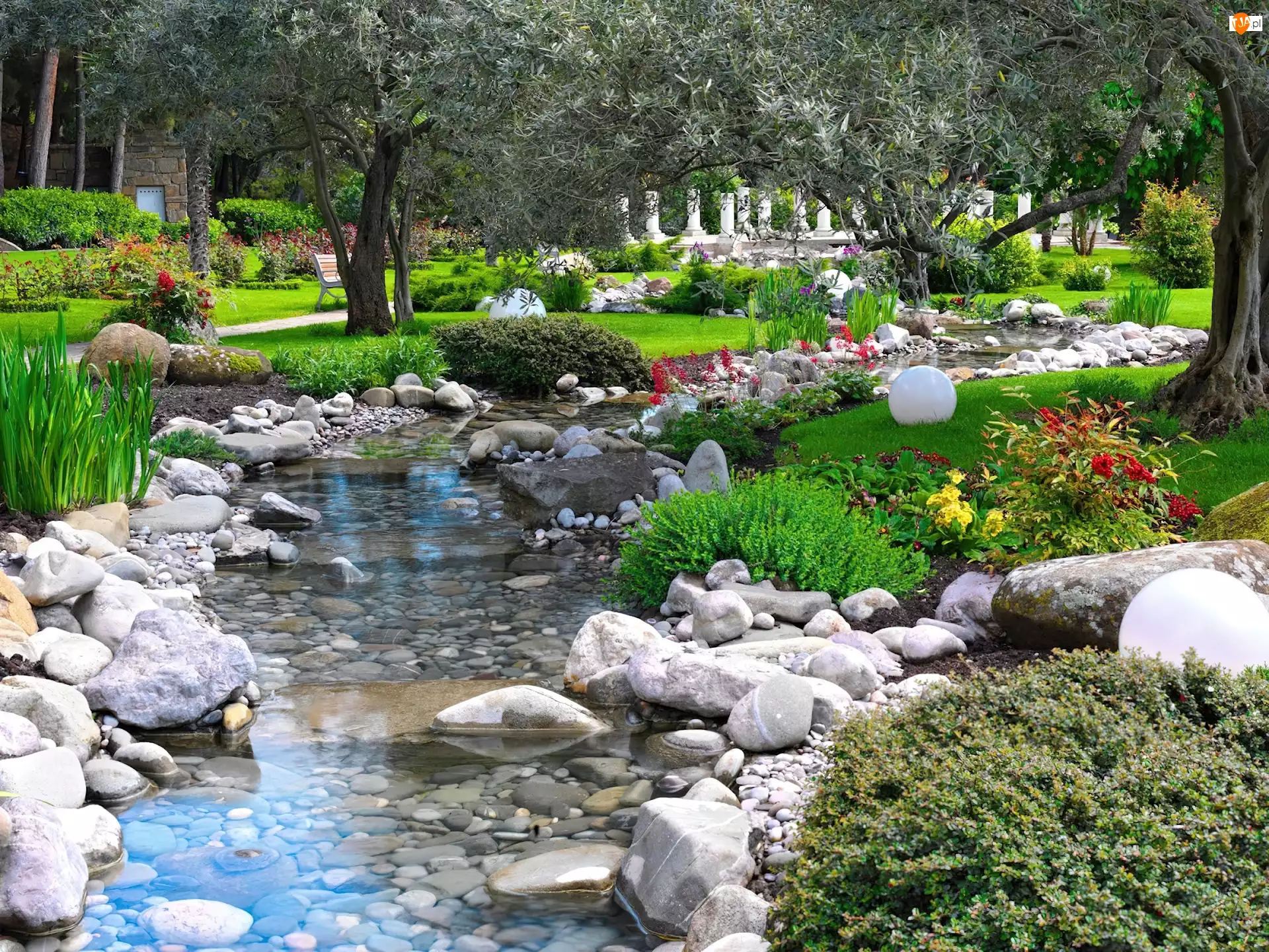 Wodne, Drzewa, Oczko, Ogród, Kwiaty