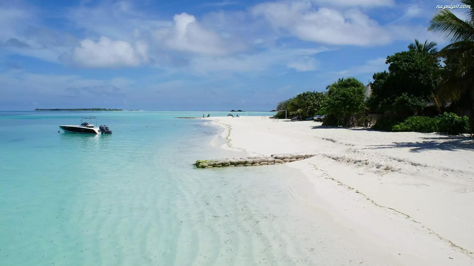 Drzewa, Plaża, Motorówka, Morze, Palmy