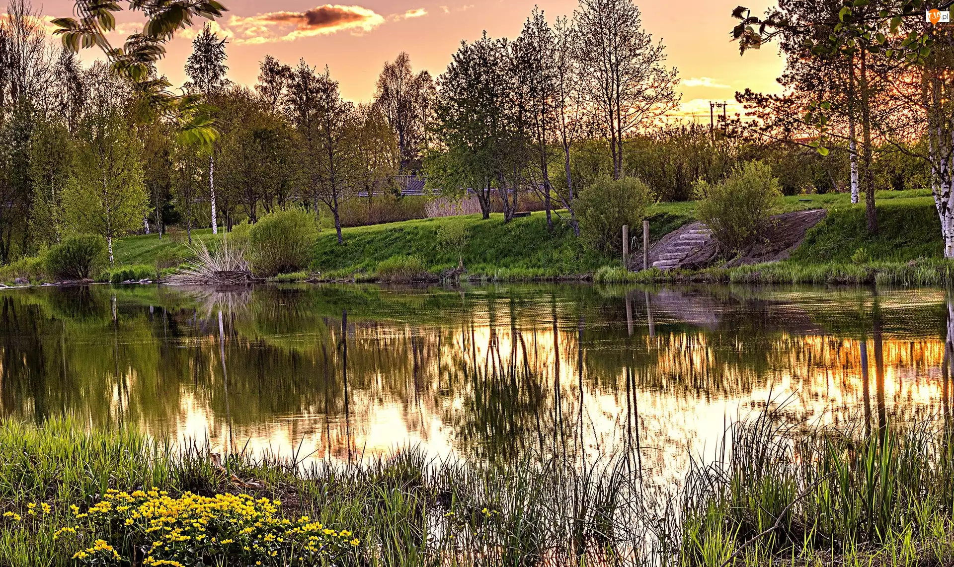 Drzewa, Rośliny, Park, Odbicie, Staw, Schody