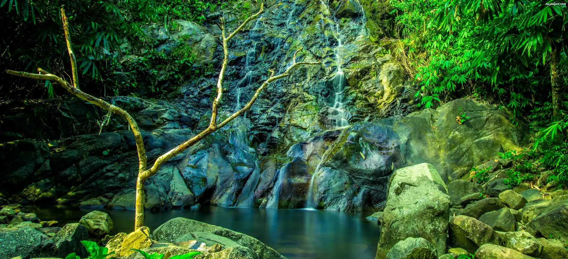 Drzewa, Skały, Wodospad