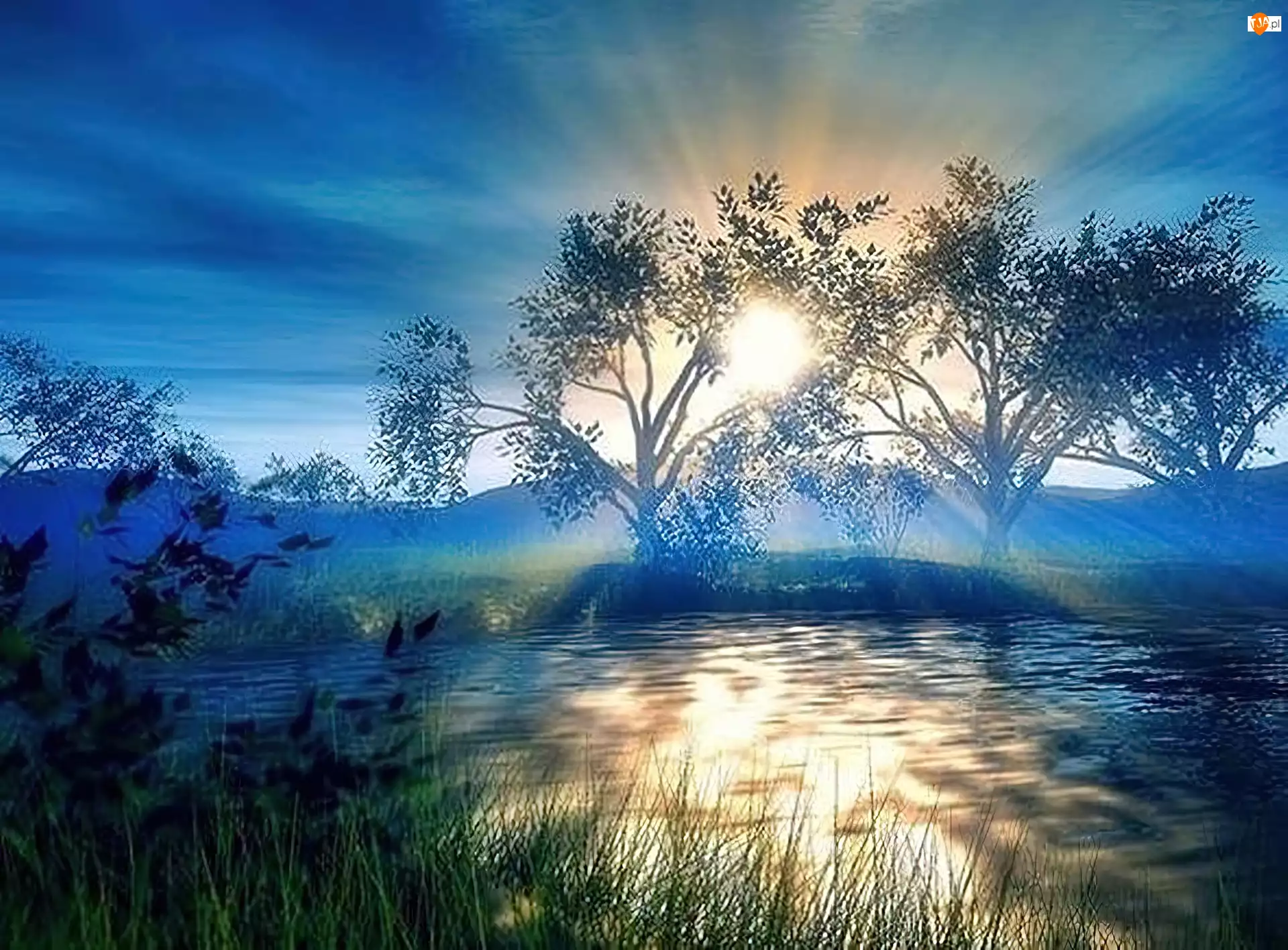 Słońca, Drzewa, Rzeka, Wschód