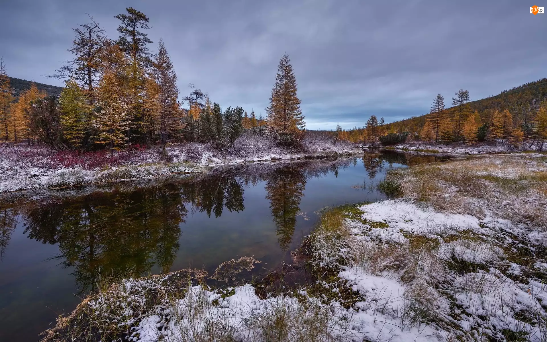 Drzewa, Śnieg, Wzgórza, Rzeka, Odbicie