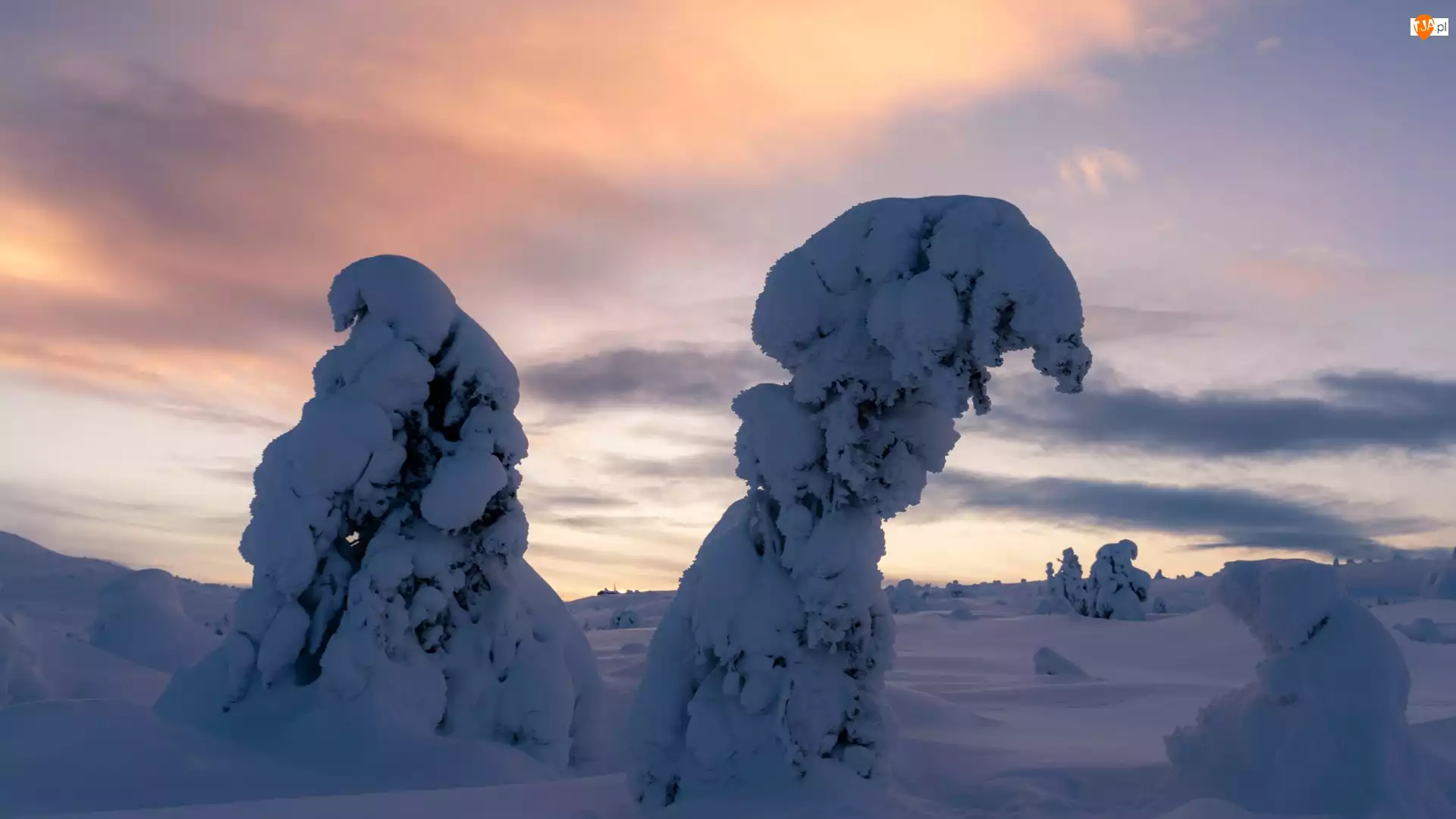 Drzewa, Śnieg, Zaśnieżone, Zima, Wschód słoń