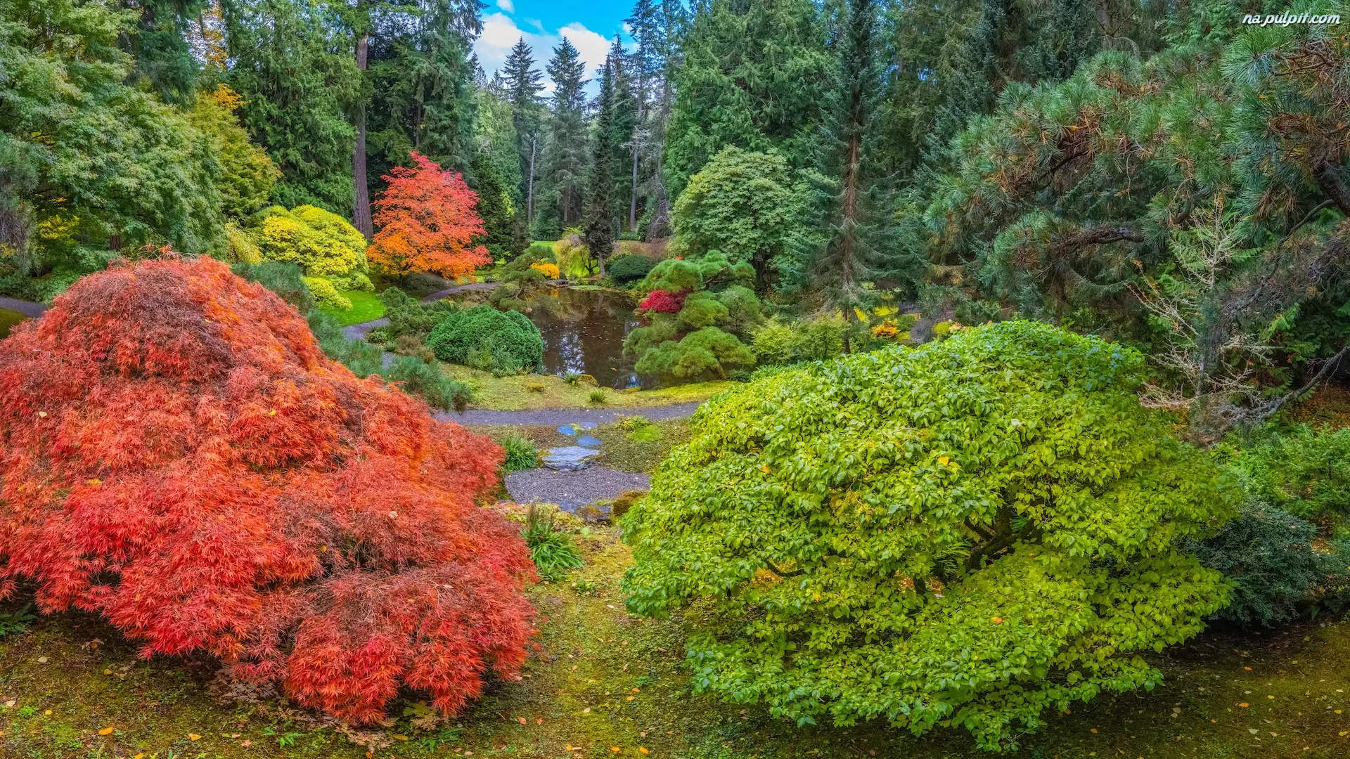 Drzewa, Stany Zjednoczone, Bloedel Reserve Bainbridge, Krzewy, Waszyngton, Jesień, Staw, Ogród botaniczny