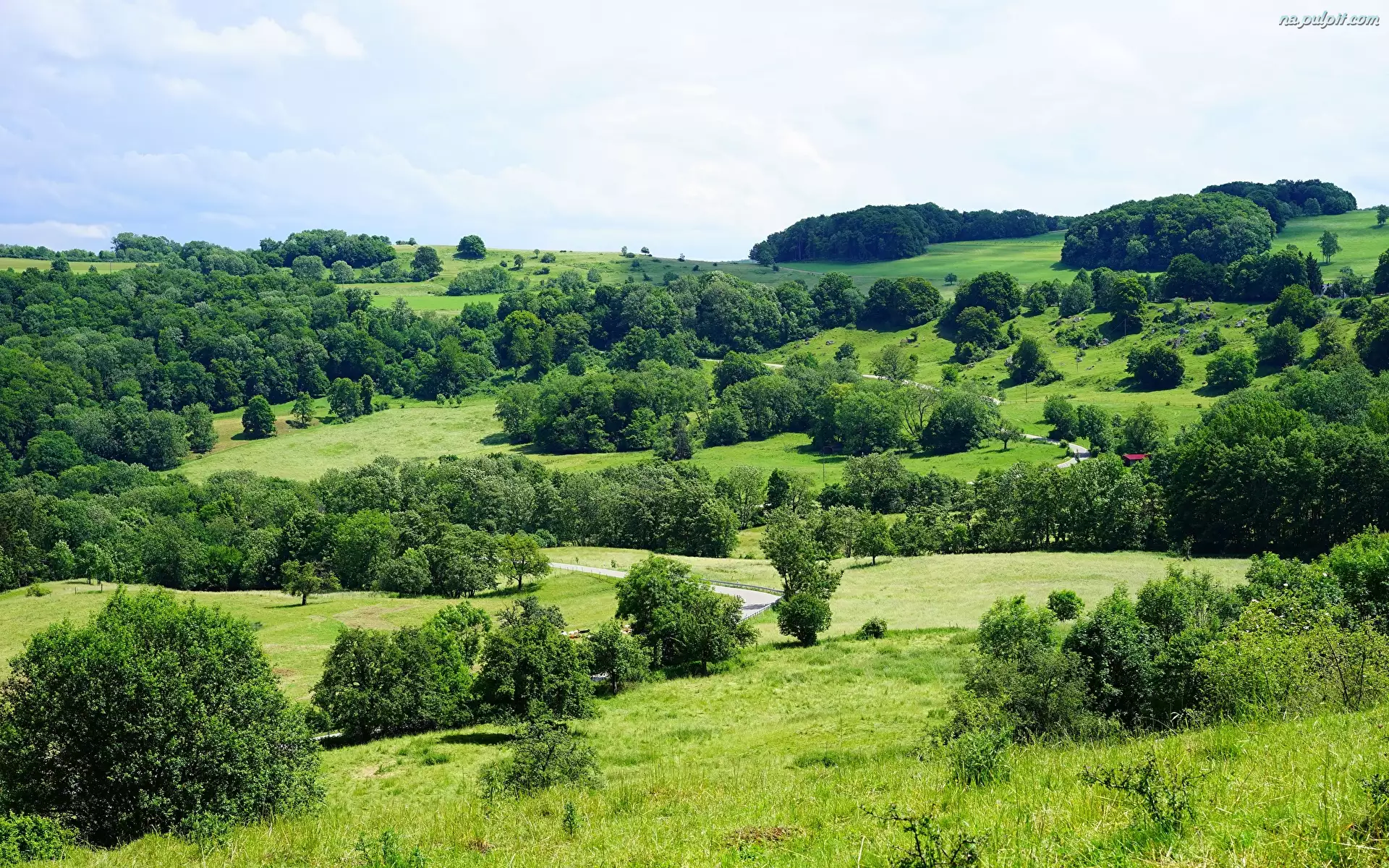 Drzewa, Trawa, Lasy, Wzgórza, Łąki