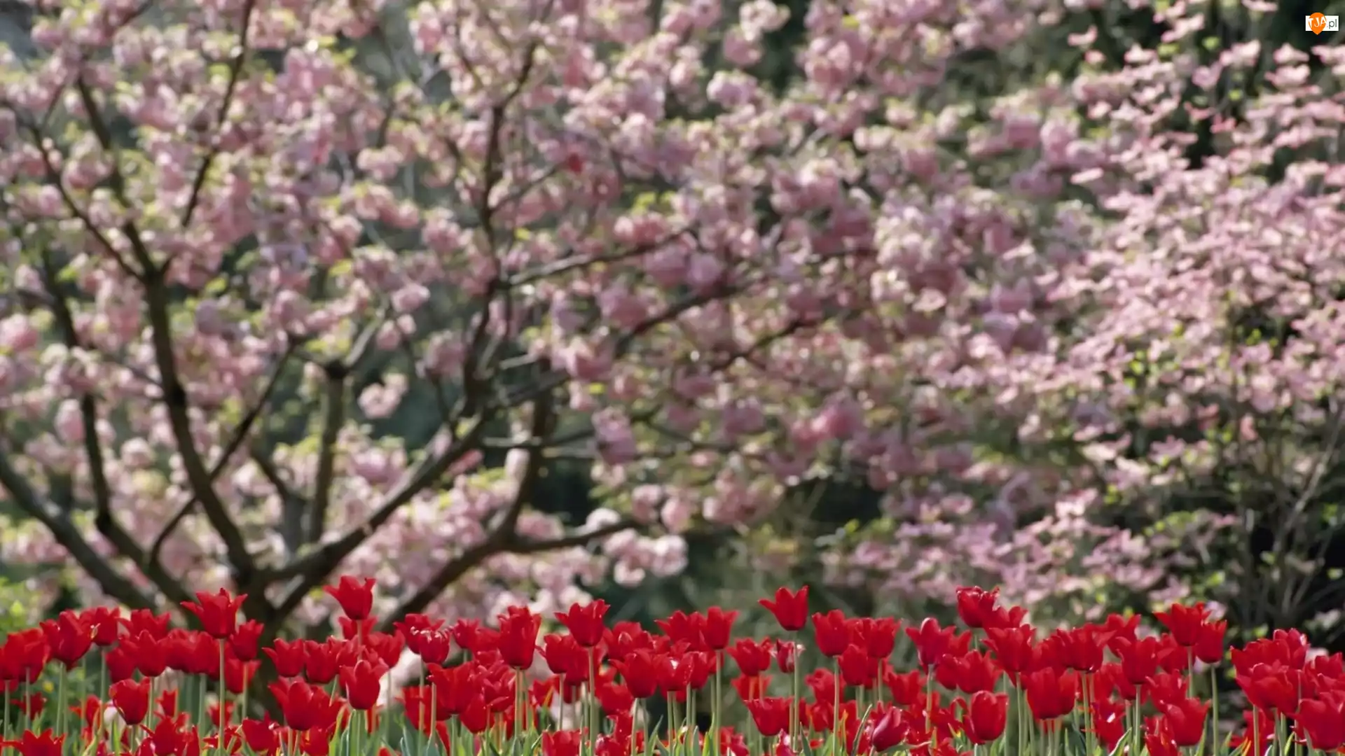 Drzewa, Tulipany, Kwitnące, Ogród, Czerwone