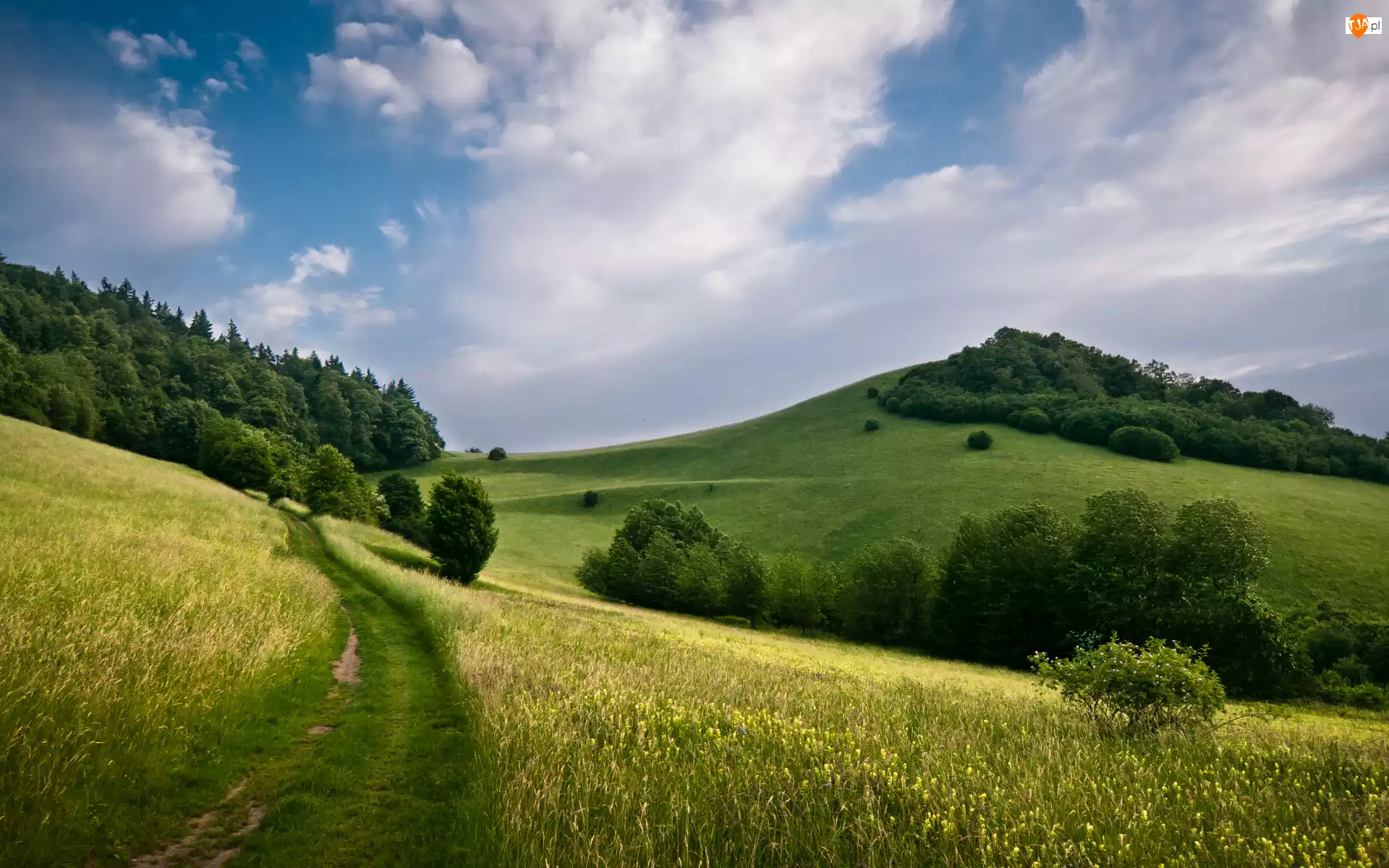 Drzewa, Wzgórza, Łąki, Chmury, Droga, Trawa