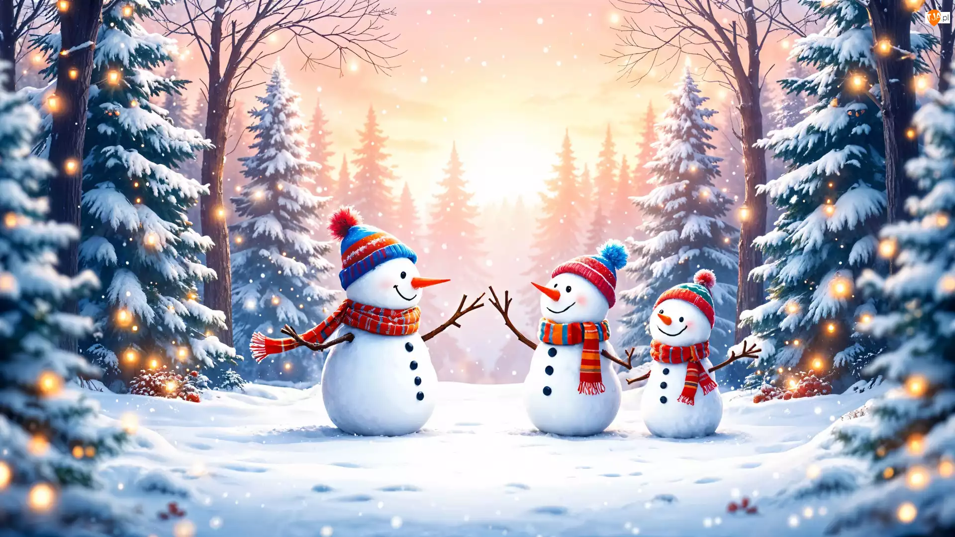 Drzewa, Zachód słońca, Bałwanki, Zima, Śnieg
