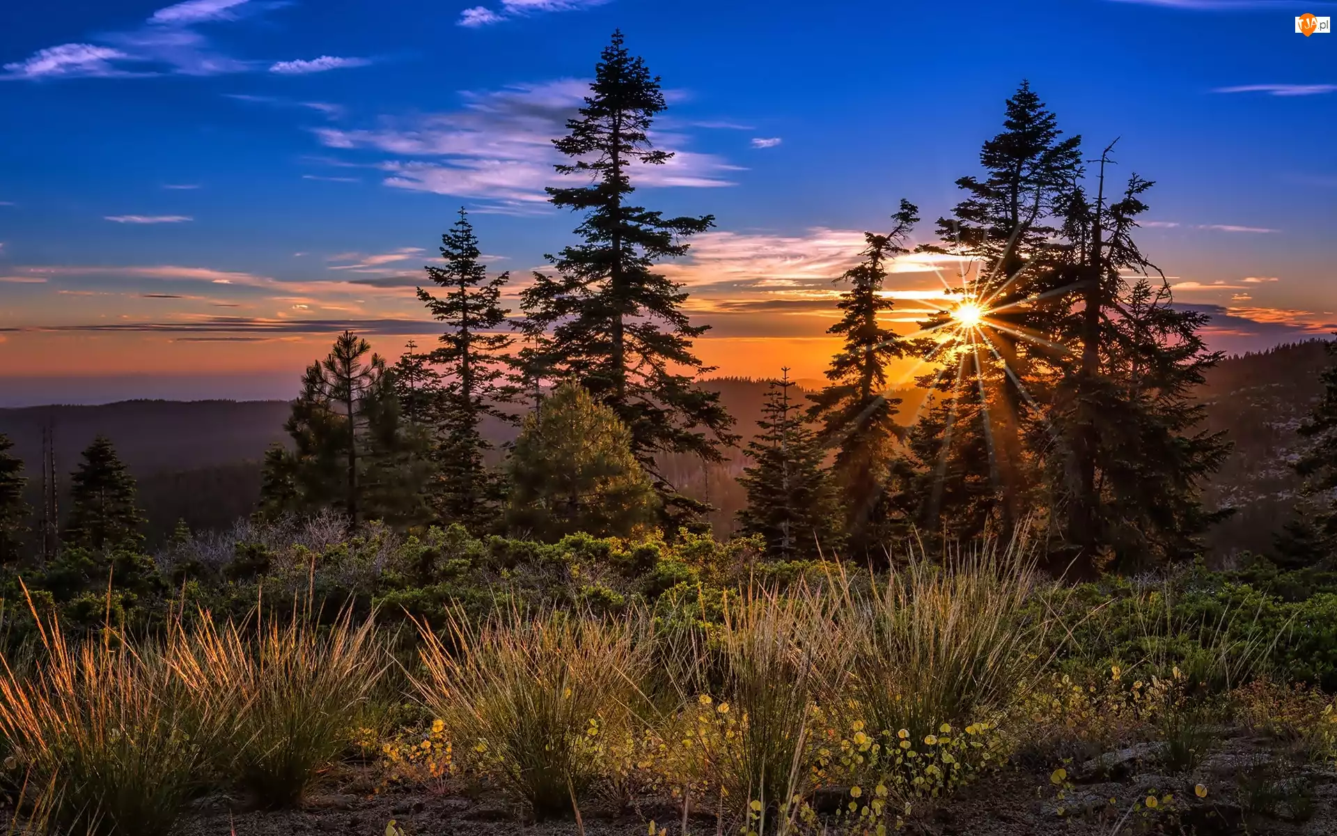 Drzewa, Zachód słońca, Krzewy, Promienie Słońca