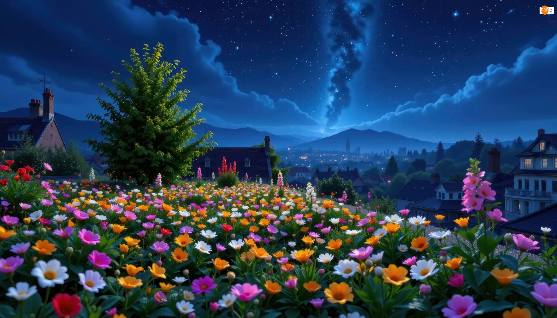 Kwiaty, Noc, Wzgórze, Grafika AI, Drzewo, Domy