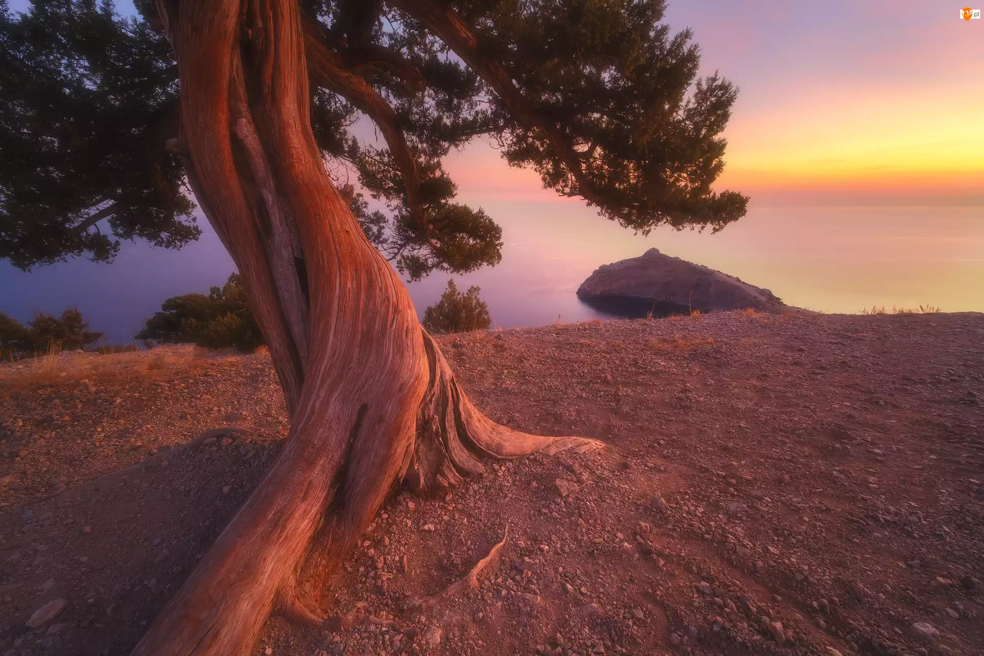 Drzewo nad morzem w blasku zachodzącego słońca