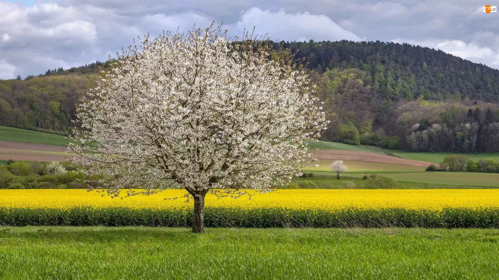 Drzewo, Wiosna, Rzepak, Pole, Góra