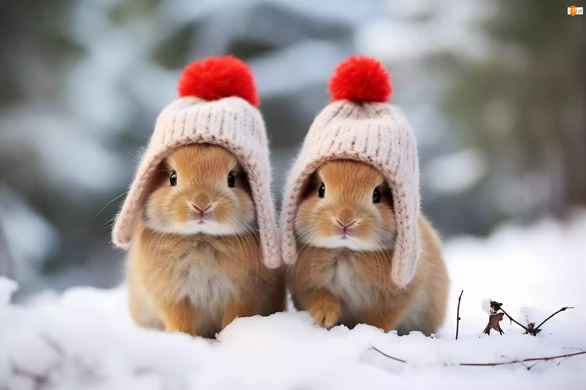 Dwa króliki w czapkach z pomponem