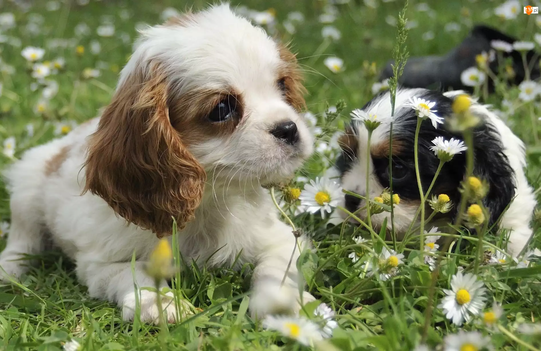 Dwa, Kwiatki, Szczeniaczki, Trawa