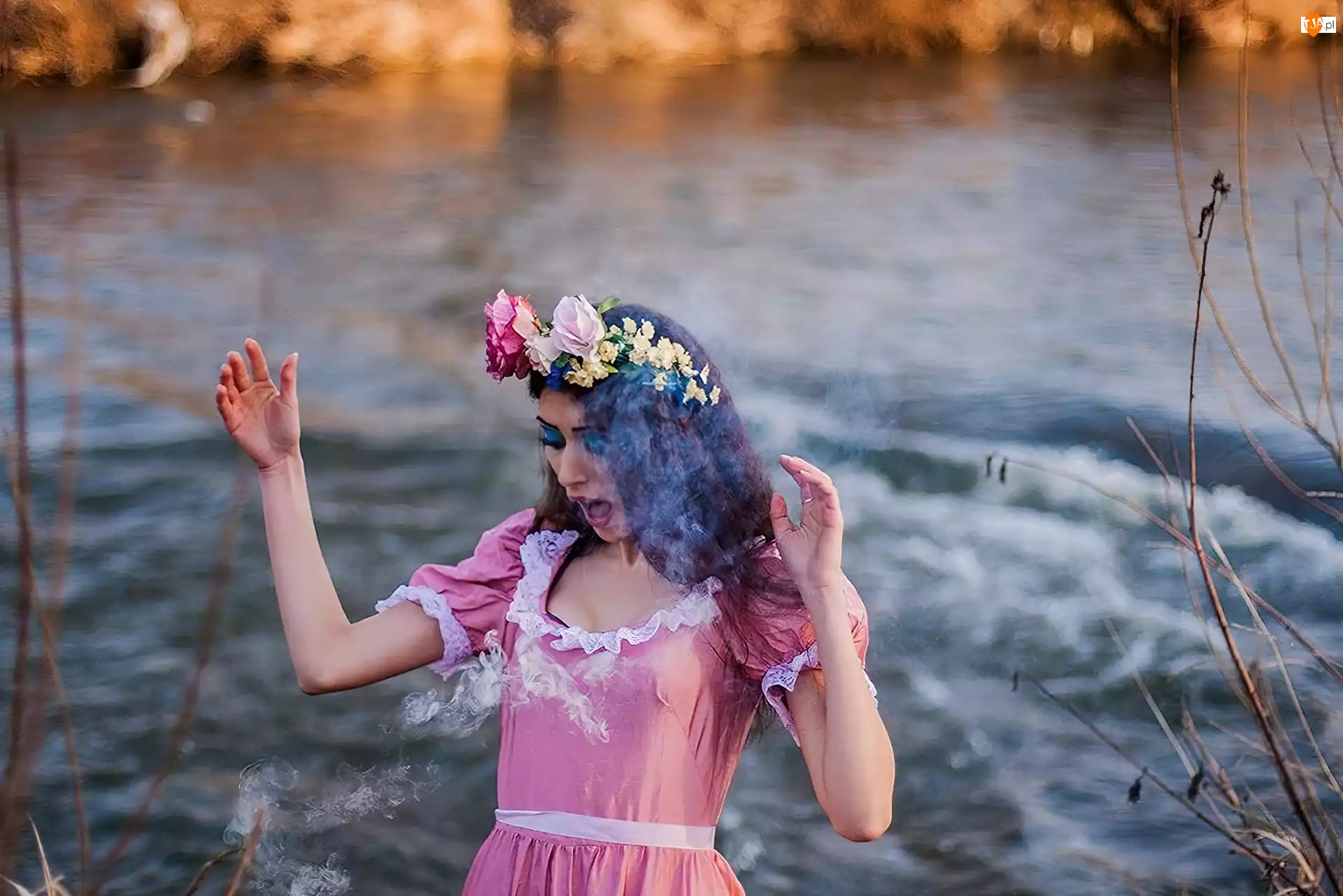Dym, Kobieta, Wianek, Brunetka, Jezioro