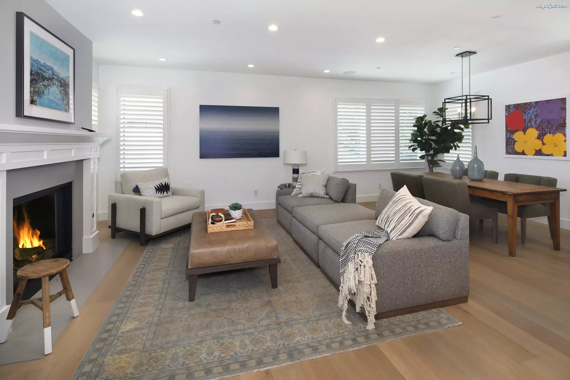 Dywan, Krzesła, Fotel, Stół, Sofa, Pokój, Pled, Poduszki, Kominek, Obrazy