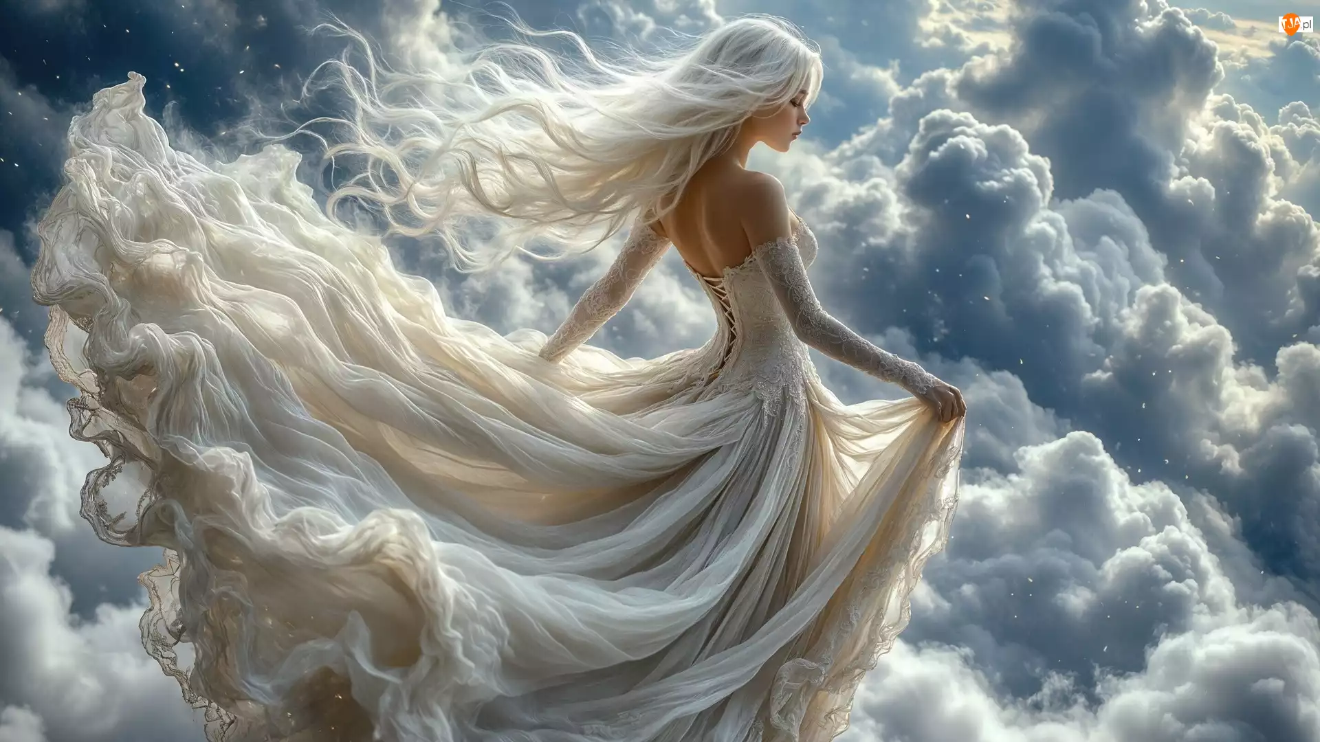 Dziewczyna, Biała, Grafika, Blondynka, Niebo, Chmury, Suknia