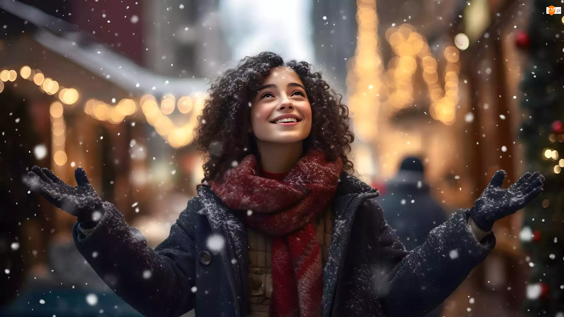 Dziewczyna, Kobieta, Uśmiech, Śnieg, Twarz, Radość