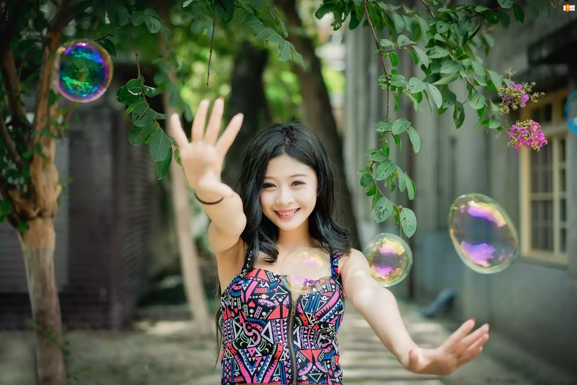 dziewczyna pod kwitnącym drzewem łapie bańki my