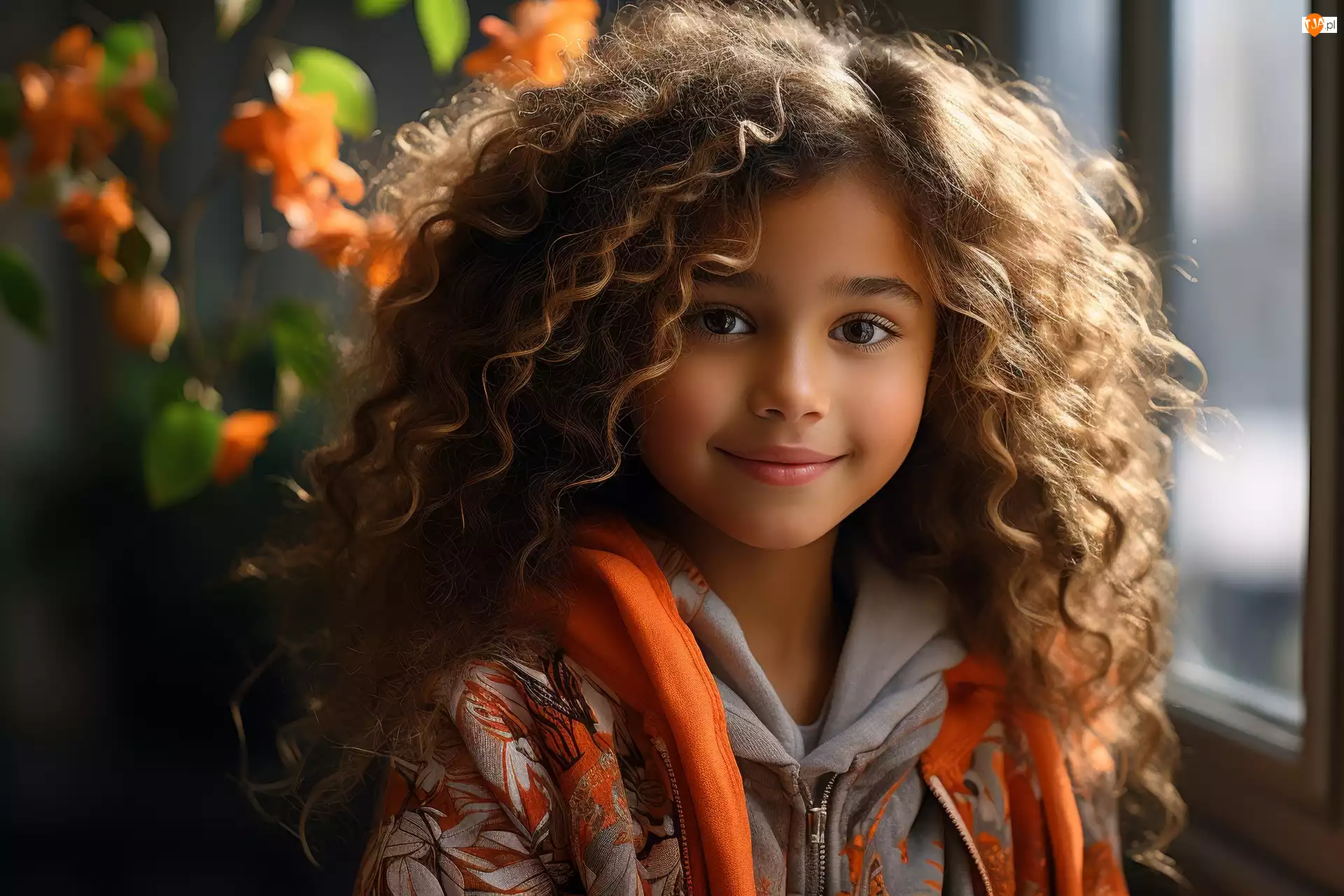 Dziewczynka, Długie, Bluza, Uśmiechnięta, Szaro-pomarańczowa, Włosy, Kręcone