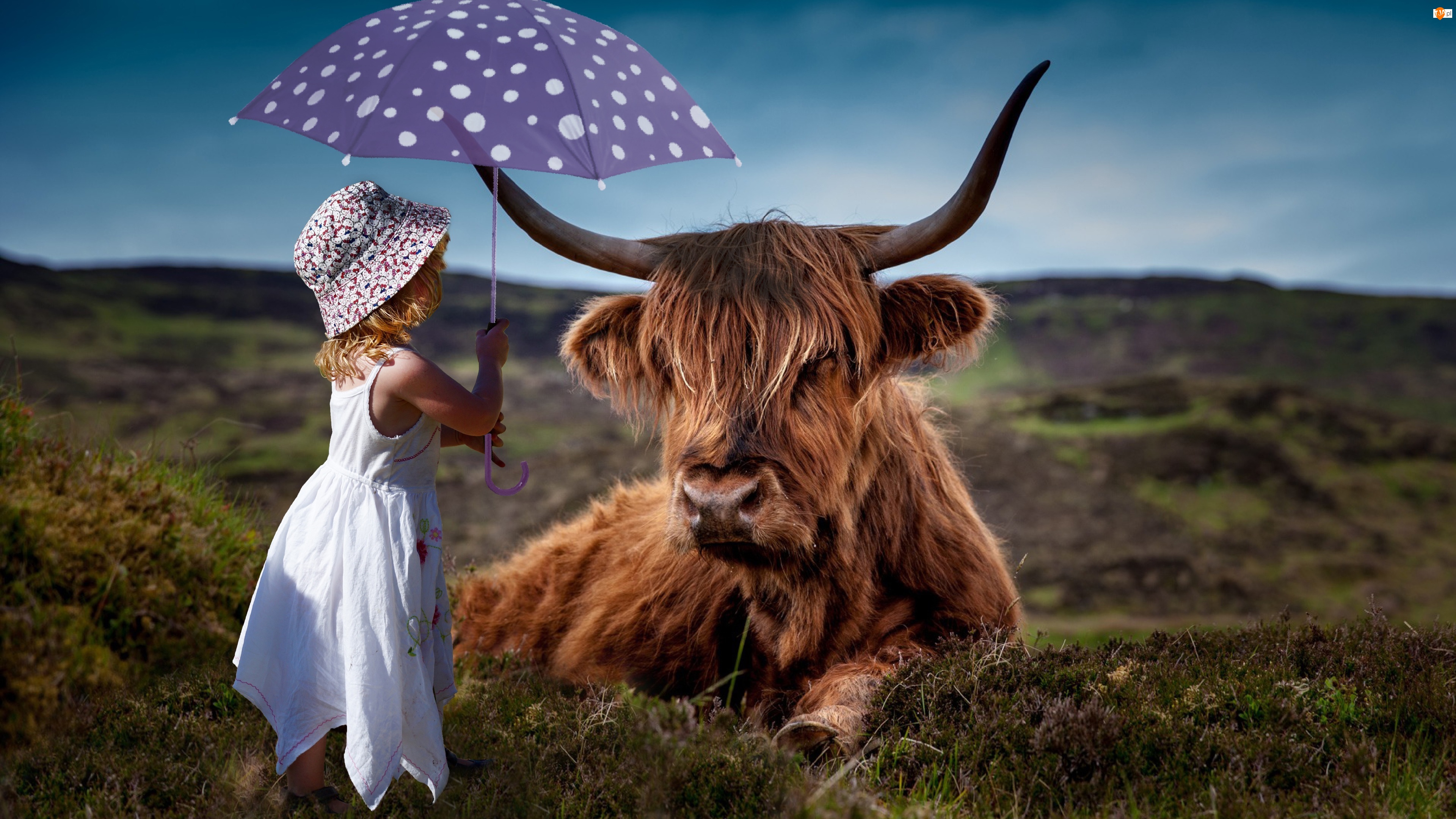 Dziewczynka, Dziecko, Krowa, Highland, Parasolka, Szkocka rasa