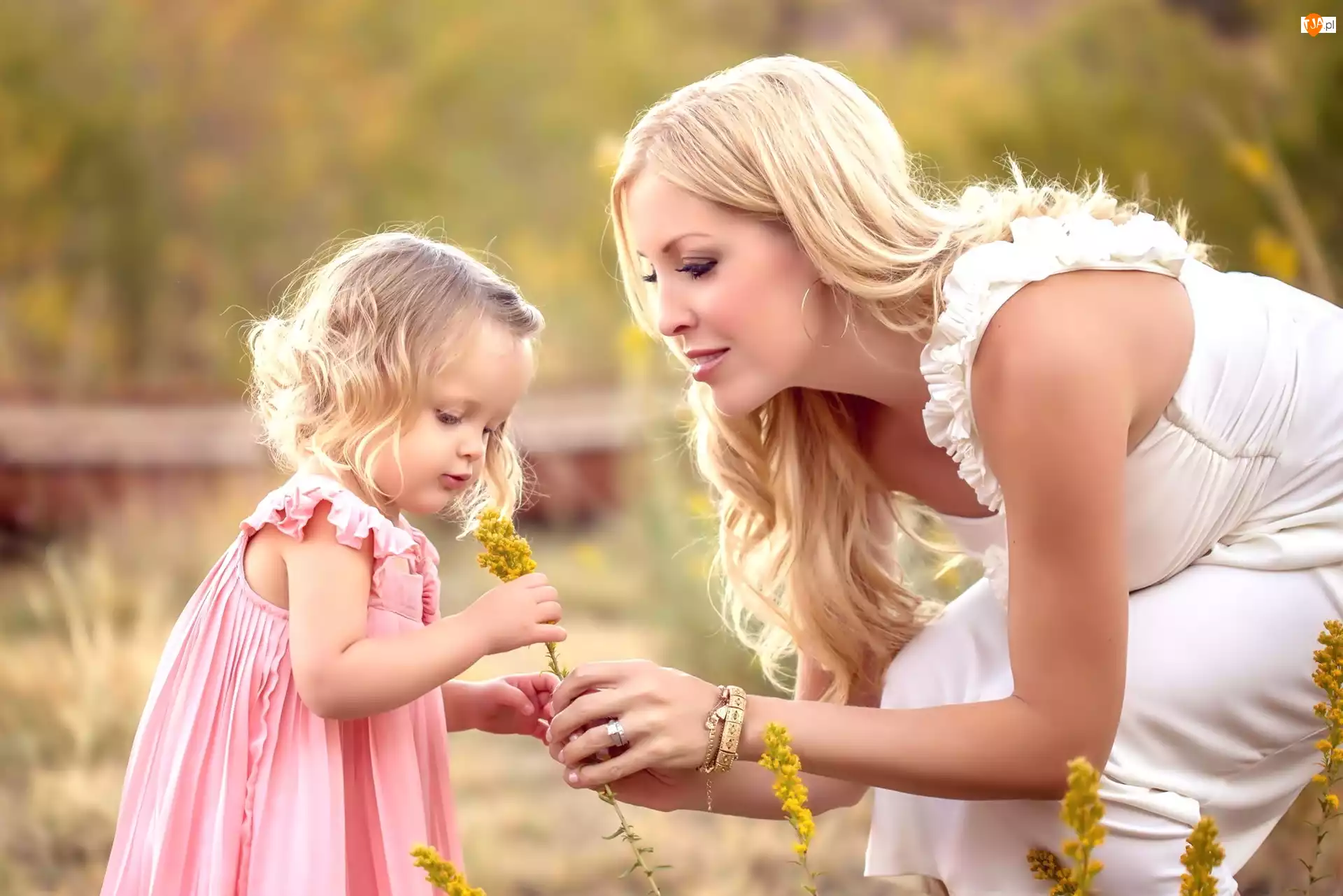 Dziewczynka, Kwiaty, Kobieta, Żółte