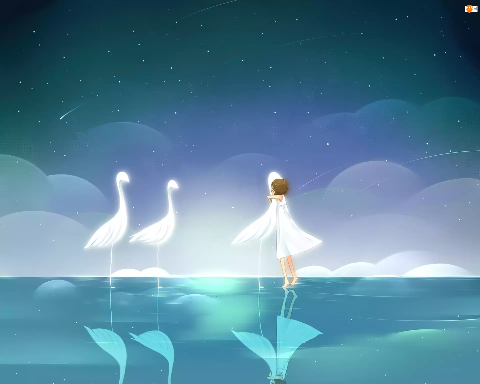 Dziewczynka, Odbicie, Tuli, Ptaki