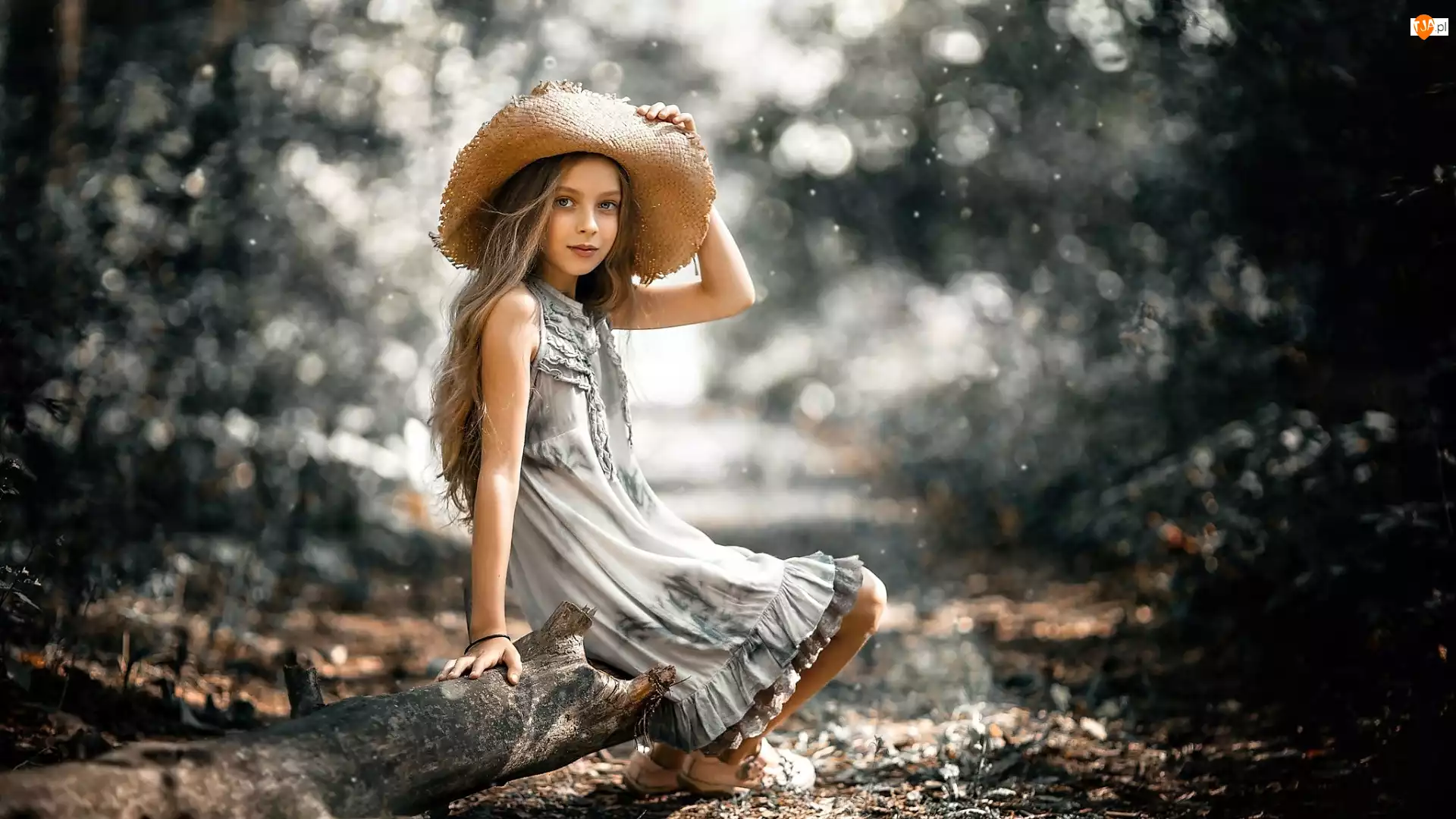 Dziewczynka w plecionym kapeluszu siedzi na kłodz