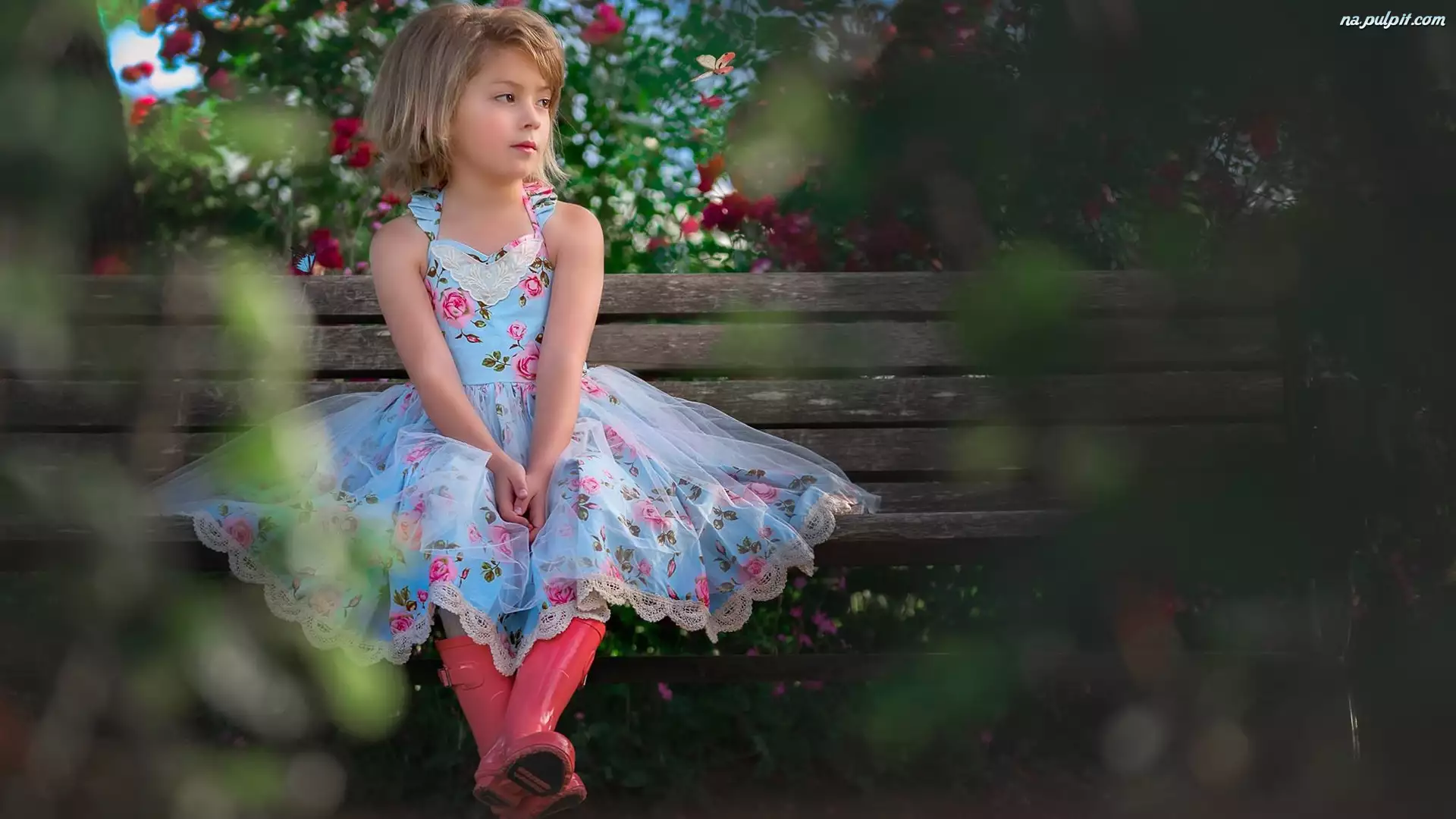 Sukienka, Ławka, Dziewczynka, Dziecko, Kalosze